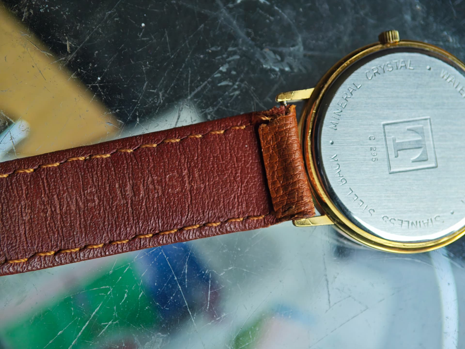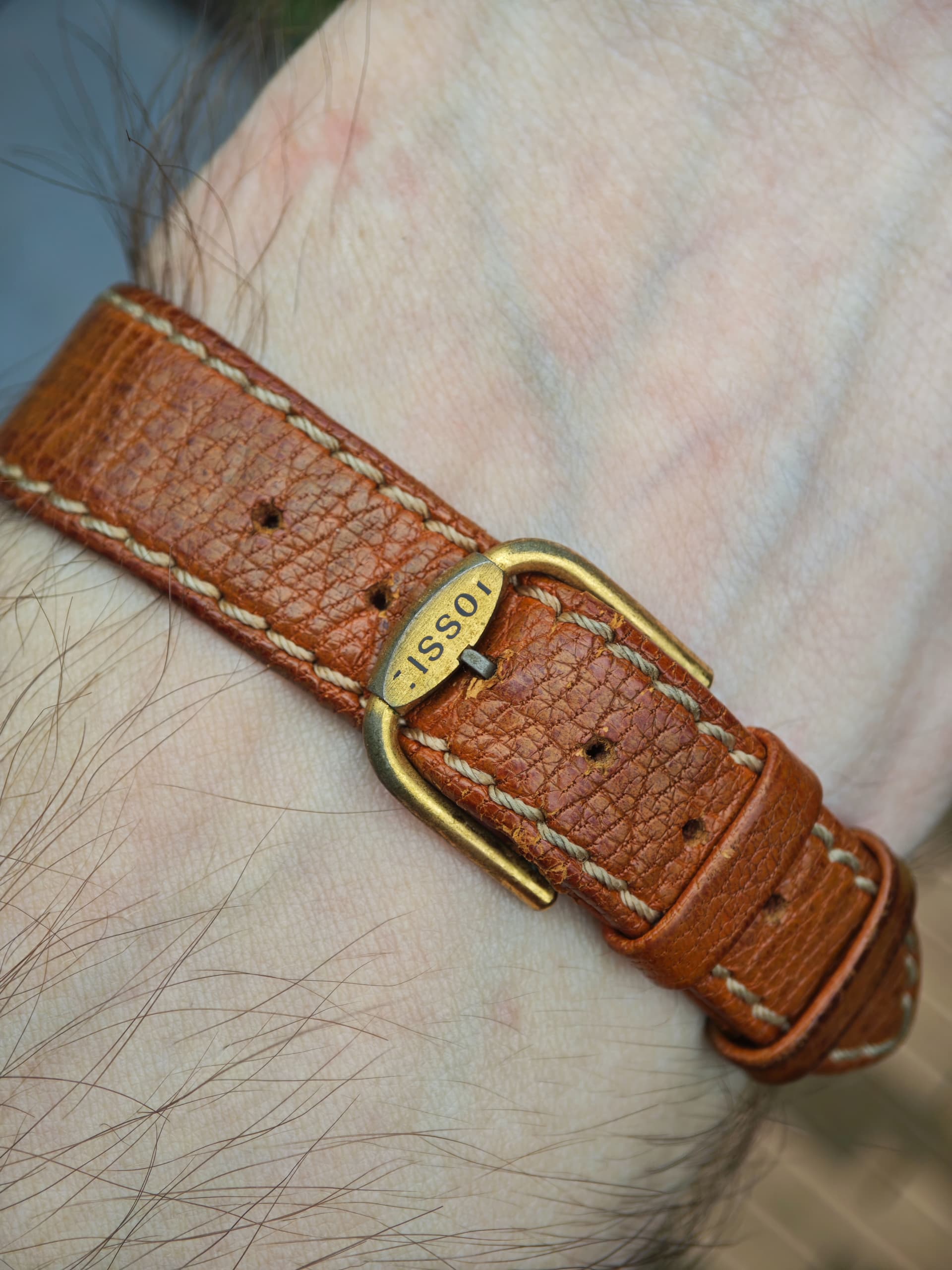 Het bandje lijkt het originele bandje, met de originele gesp. Is redelijk versleten dus een mooi bruin bandje zou hem goed staan.