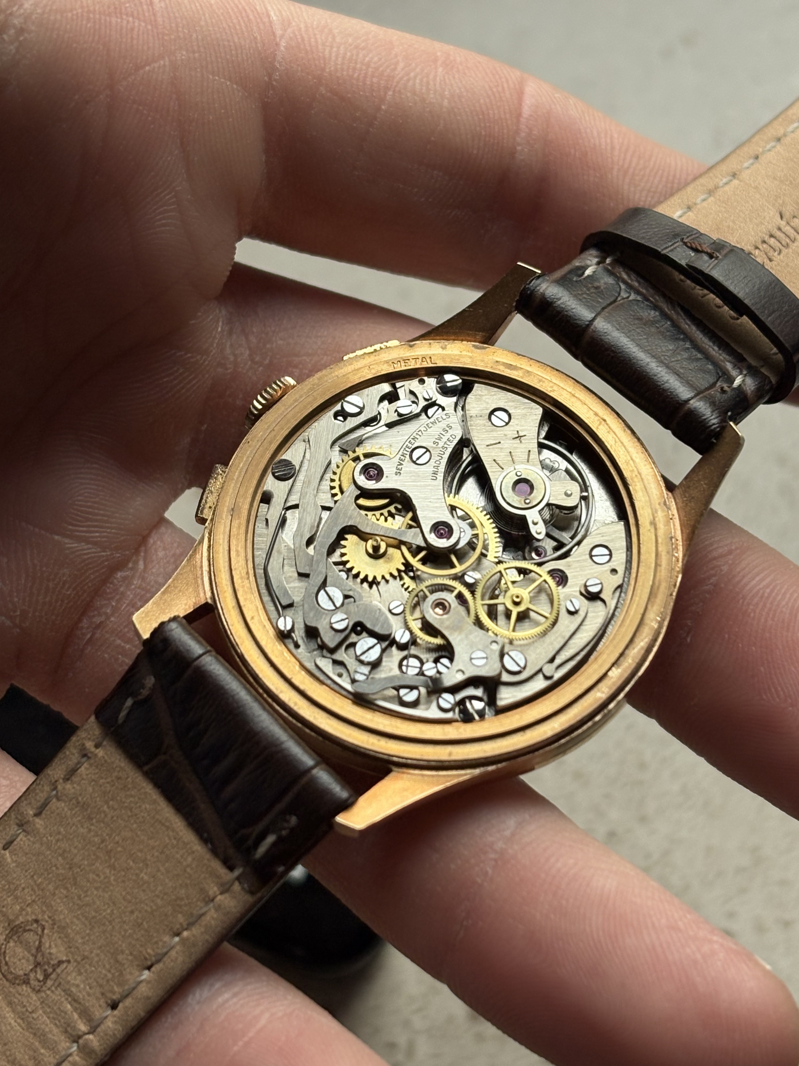 Het uurwerk heeft een dubbele achterkant, waarbij de caseback is vervaardigd uit 18 karaats goud en voorzien is van goudstempels.