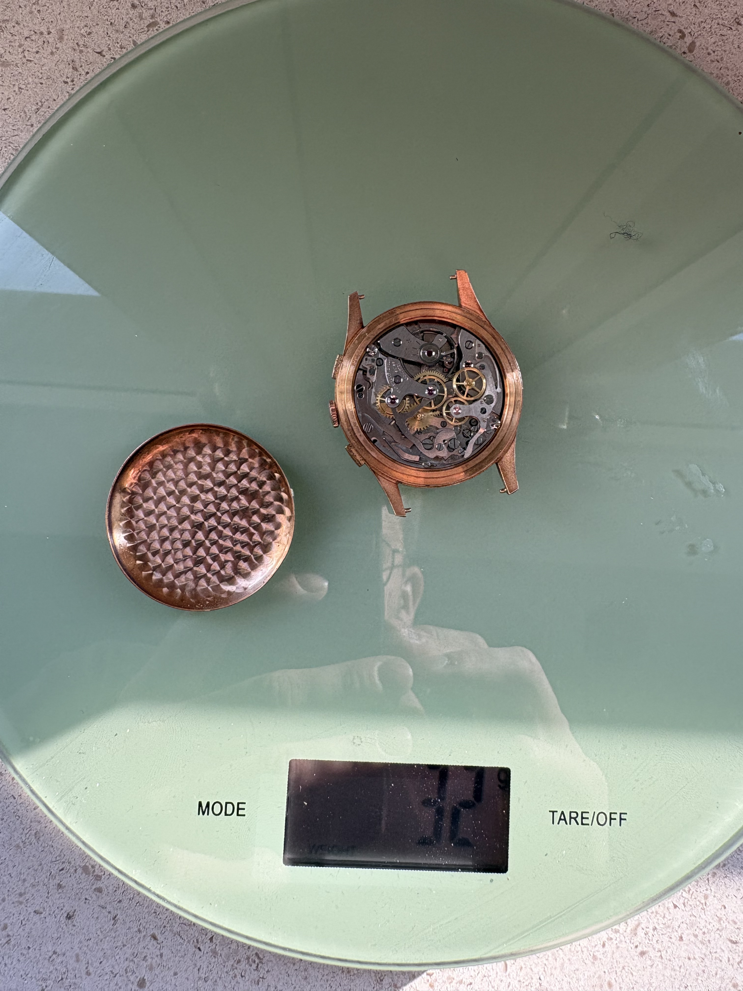 Het gewicht is 32 gram zonder dustcap. Ik heb mij laten wijsmaken dat er ±10 gram goud overblijft minus onderdelen. Dat zou €1000,- aan goud zijn.
