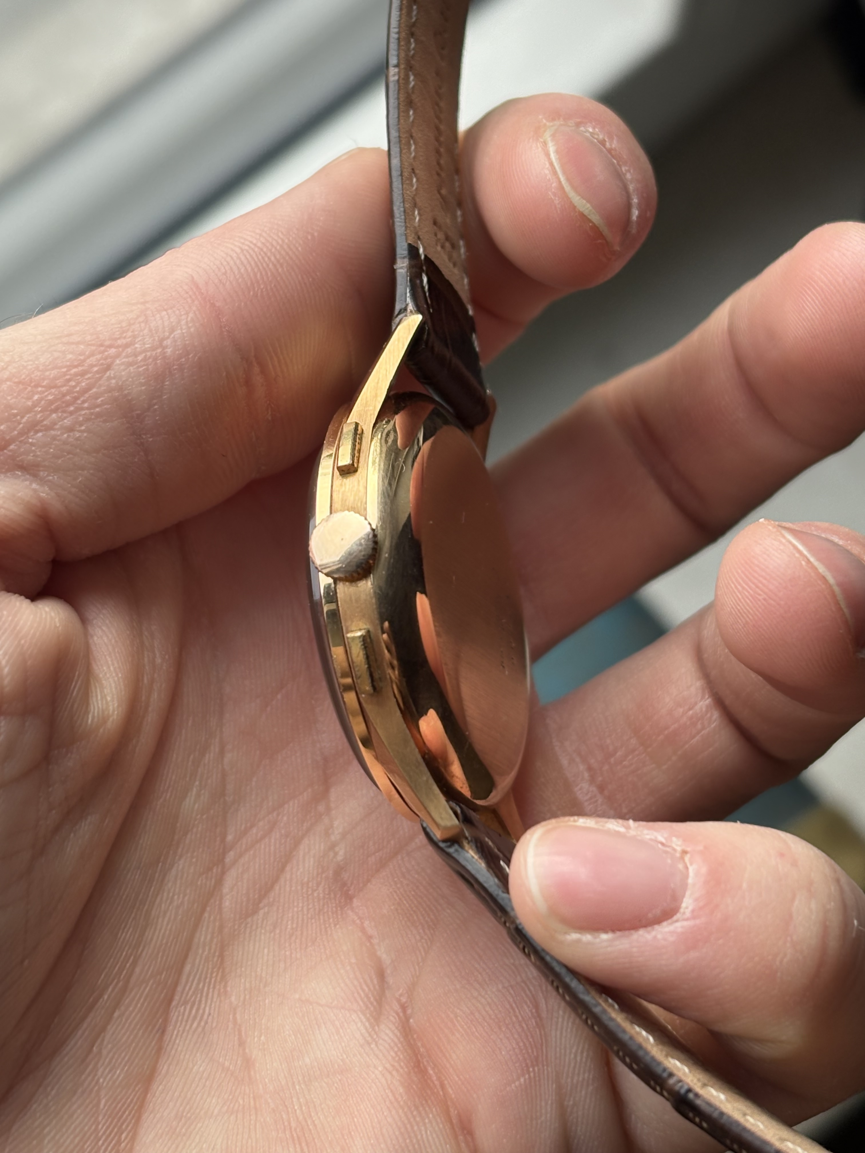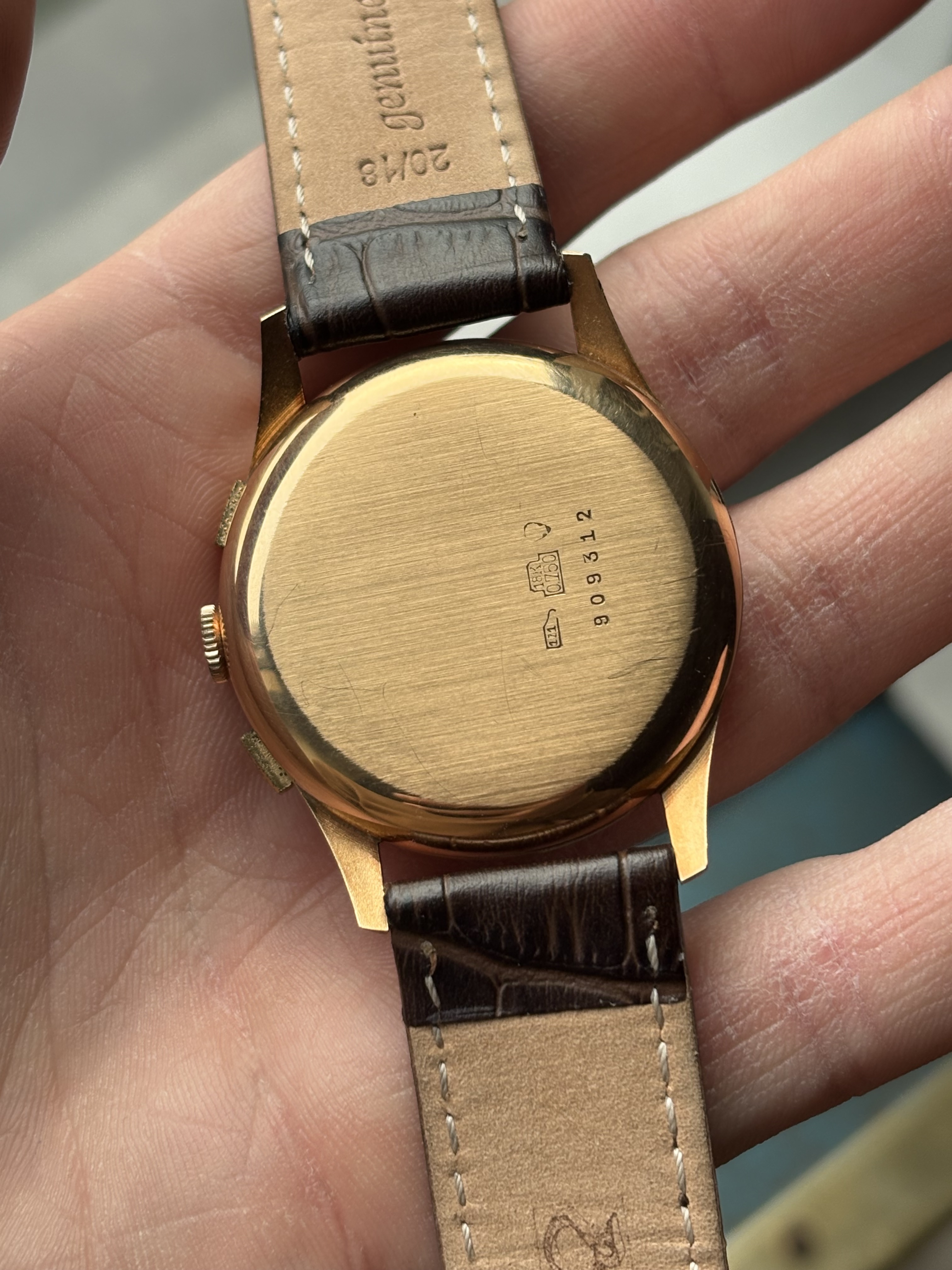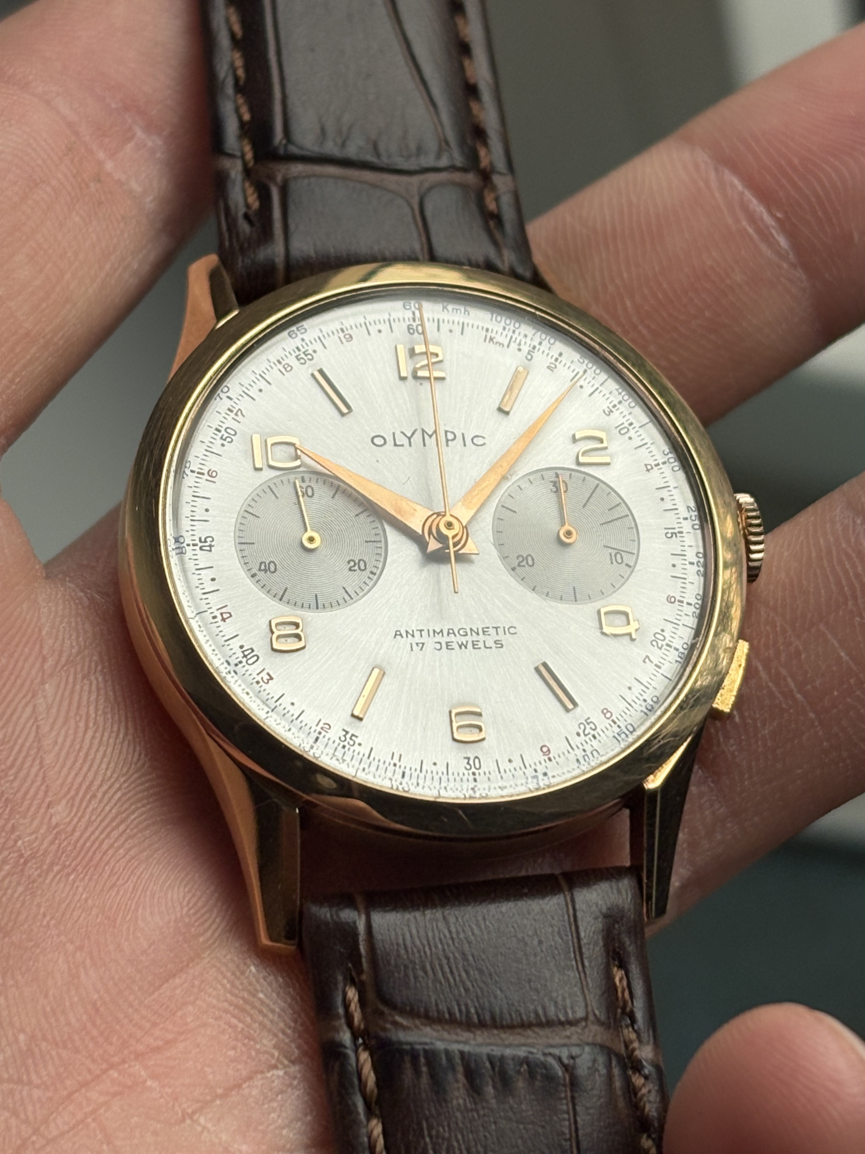Een knappe gouden Olympic vintage chronograaf in 18 karaat massief goud. Een prima prijs gezien de goudprijs dezer dagen.