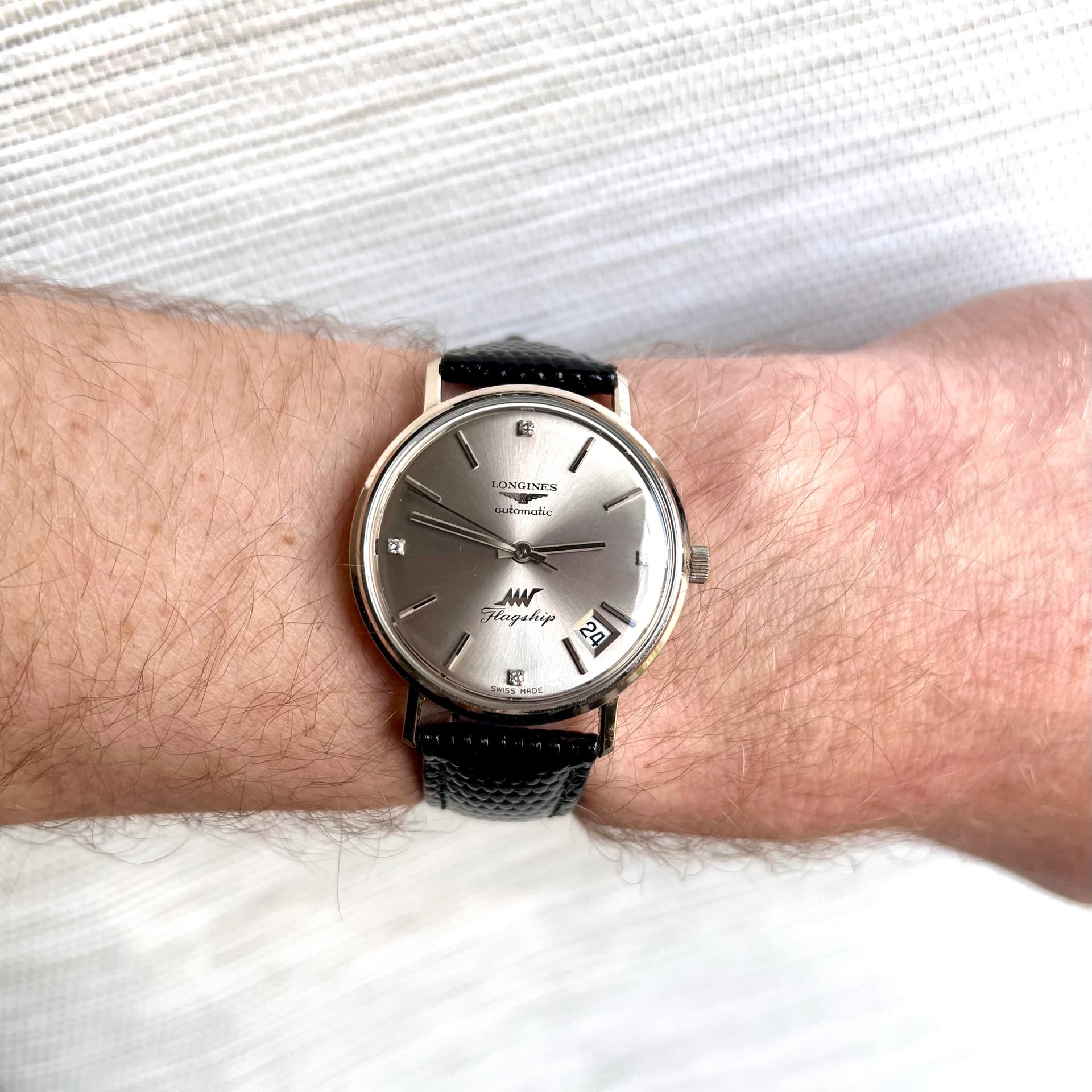 Aangeboden mijn Longines Flagship Ultra-Chron. Met het 431 Highbeat 36000 bph uurwerk, genaamd Ultra Chronometer. Een prachtig exemplaar in 18 karaat witgoud. Zeer zeer zeldzaam model die de tijd heel goed heeft doorstaan. Compleet origineel met zeer geringe gebruiksporen. De dial en wijzers zijn tevens in 18k en de dail is gezet met 4 vonkelende heldere diamanten. Waar de datum op 5 uur is geplaatst. Bellissimo !