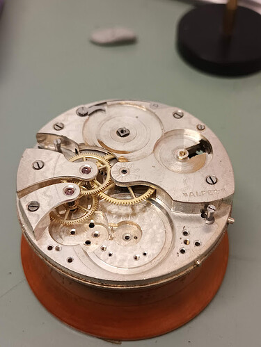 het begon bij de deksteen van de balans: die zag er zo uit: in 3 stukken en netjes terug geplaatst, wat kan omdat je die deksteen eerst legt en dan de brug erop en vastschroeft. Maar het is niet omdat dat kan, dat je dat zo ook doet. Door deze domme het kan herstelling liep het horloge niet.