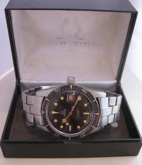 De kast van mijn tweede Titus (ref. 7085, het exemplaar dat ik al had heeft ref. 7840) is wat dikker en heeft doorboorde bandaanzetten (drilled lugs). De kroon is even groot maar schroeft netjes in de kast. Ook heeft deze kroon niet het lauwerkransje (logo) dat de ‘luxe’ Titus wel heeft. De wijzerplaat heeft een wat meer grijzere opdruk en wat lichter tritium. Het glas is origineel, echter vaak gepolijst: het loupje vervormd een beetje. De datumschijf is niet tweekleurig (even en oneven data) zoals bij de 7840. De duikring is anders en ligt wat hoger op de kast, om de kroon niet in de weg te zitten. Hij glanst wat meer dan die van de Titus op staal. De wijzers zijn een beetje verweerd, waar dat bij de zondags-Titus ook niet het geval is.