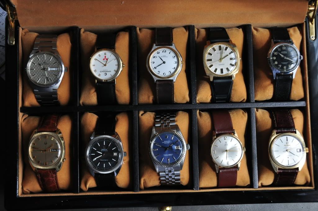 Ziehier mijn 36 mm horloges. In de onderste rij worden een Rolex en een Tudor geflankeerd door twee Omega’s. De bovenste rij bevat wat leuke stukjes.