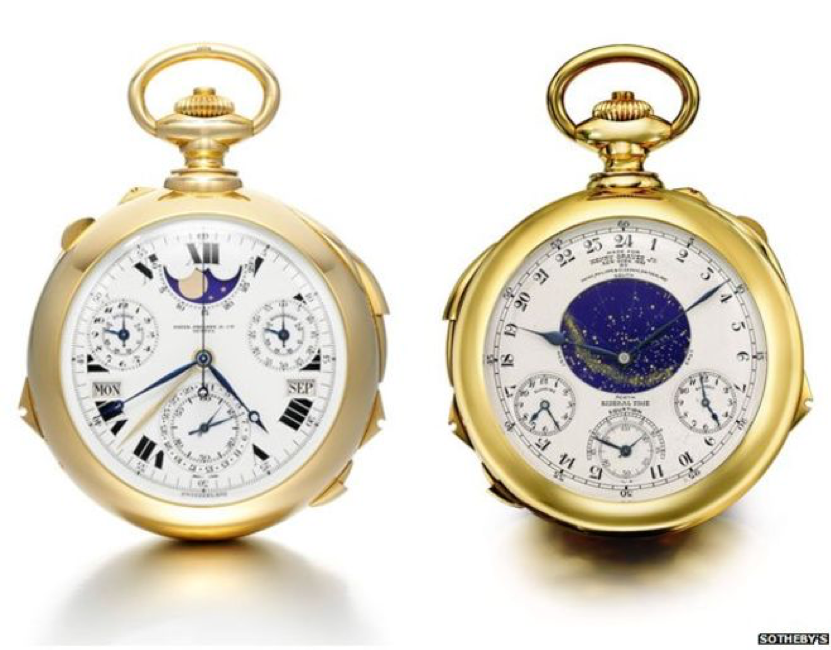 Met 24 complicaties mag het met recht supercomplication genoemd worden. Oa Perpetual calendar, minute repeater, sideral time etc. Minder gecompliceerd dan de cal. 89 maar deze werd wel ruim 60 jaar eerder gemaakt. Niet voor zomaar iemand; Henry Graves Jr. Een van de belangrijkste bankiers van New York. Tevens een verzamelaar en erg competitief, hij liet dit horloge maken om een andere belangrijke verzamelaar te verslaan en het record gecompliceerdste horloge te bezitten. Hier had hij flink wat voor over: 15 duizend dollar. Gecorrigeerd met inflatie omgerekend 2 ton. Schijntje vergeleken met het veilingresultaat van 2014: 24 miljoen!