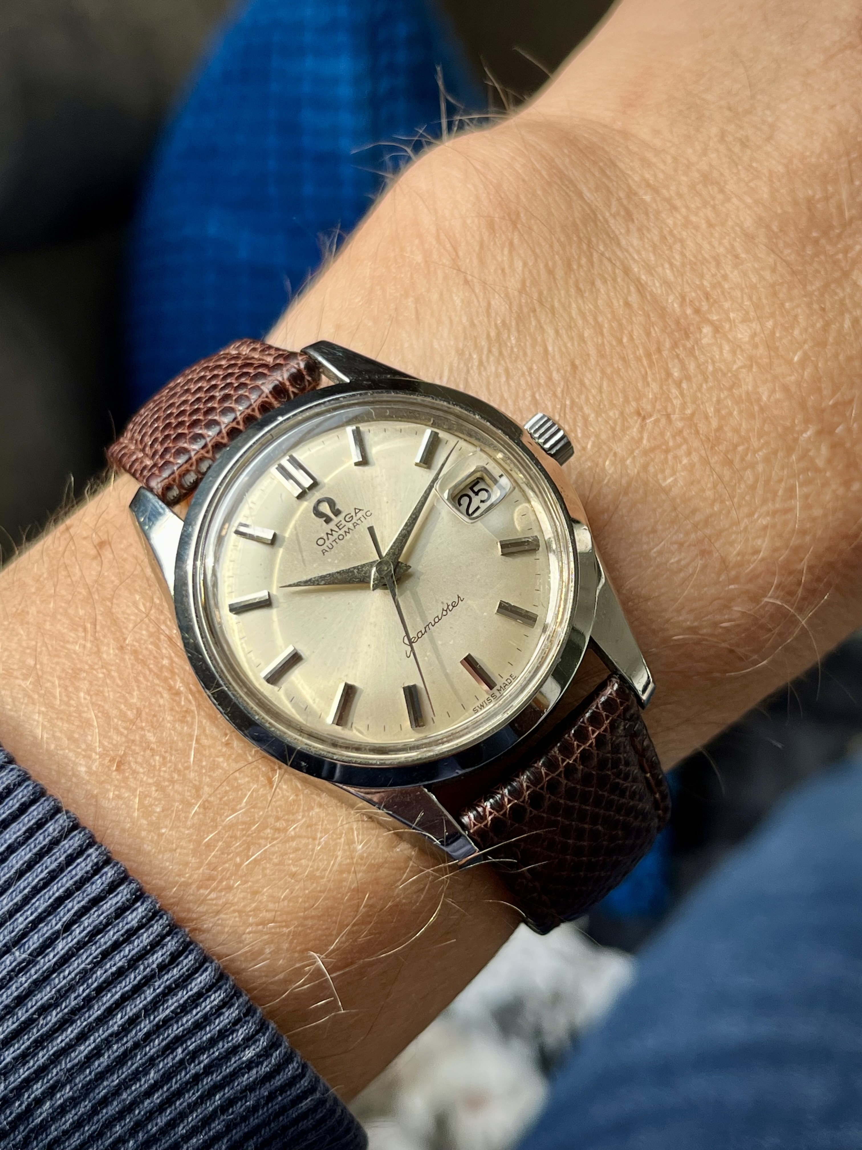 De wijlen eerste eigenaar kocht het horloge in 1969 van zijn eerst verdiende geld op de grote vaart als machinist. Hij droeg het altijd en overal en na vele jaren was het behoorlijk gekrast. In 2008 heeft hij een 2e Omega gekocht welke wat robuuster was en een bekende horlogemaker heeft het horloge helemaal gerestaureerd. Er is onder andere een nieuw origineel Omega glas in gezet en het zou me niet verbazen als er e.e.a. aan krassen weggewerkt is. Daarna droeg hij het alleen tijdens bijzondere gelegenheden. Aldus zijn zoon die het horloge aan mij geschonken heeft.