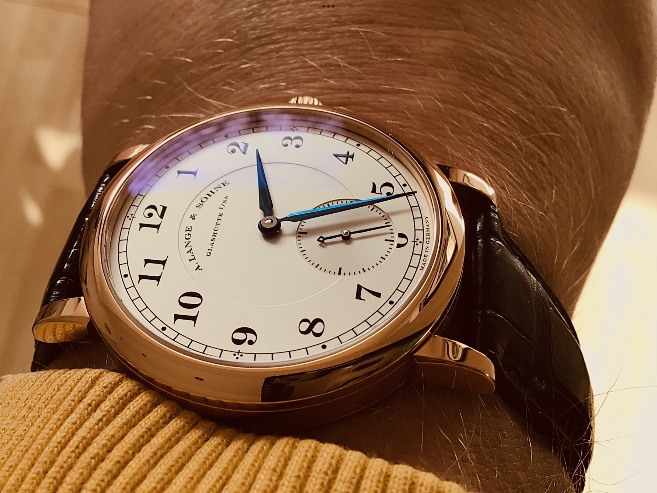 Het grappige is namelijk dat deze Lange dus al wel letterlijk talloze malen gespot en becomplimenteerd is om z’n schoonheid. Voornamelijk ook nog eens door mensen die totaal niks met horloges hebben. Sommigen kwamen echt superlatieven te kort en zaten eindeloos naar het horloge te staren voor ze iets zeiden. Op echt een hele enkele uitzondering na kent niemand vervolgens het merk als ze doorvragen, maar men vindt dit aan de pols bij iemand anders gewoon wel buitengewoon fraai! En dan dus ook nog eens gespot door alle leeftijden, man, vrouw, bemiddeld en onbemiddeld etc.