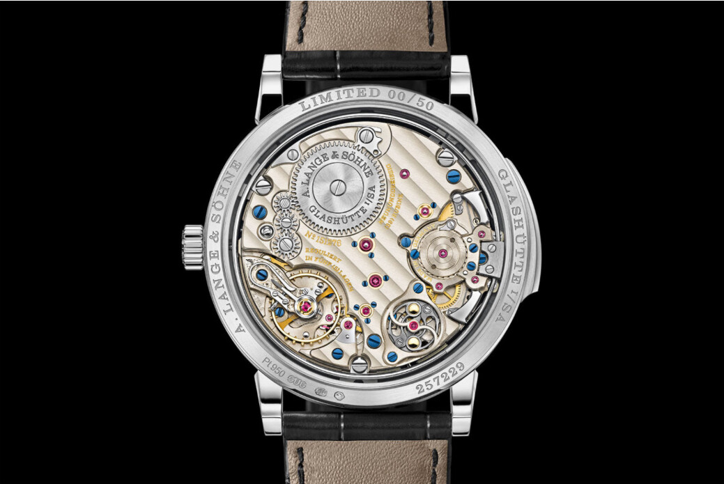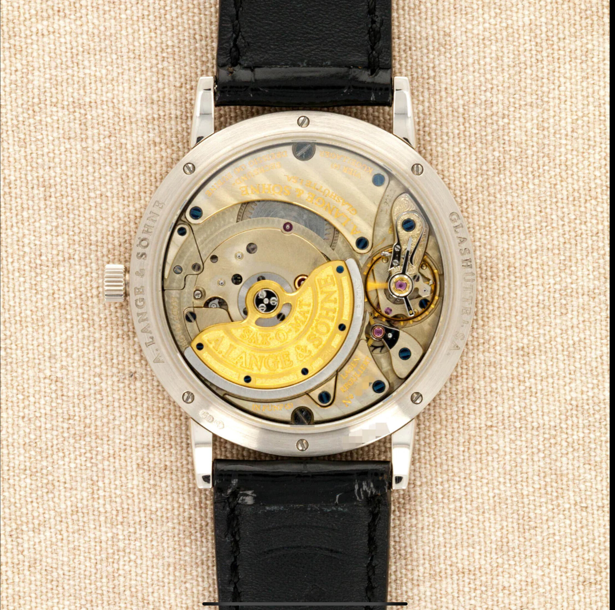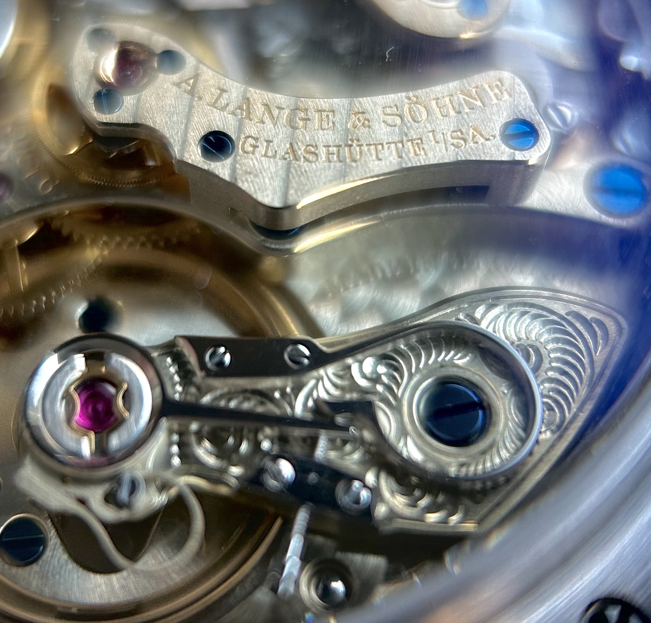 Dikke “anglage”, hand gravure, “german silver”, “black polishing”, perlage, geblauwde schroeven, Glashütte striping. Allemaal te zien, tussen de stofjes en zo door . Net als de “diepte” van het uurwerk.