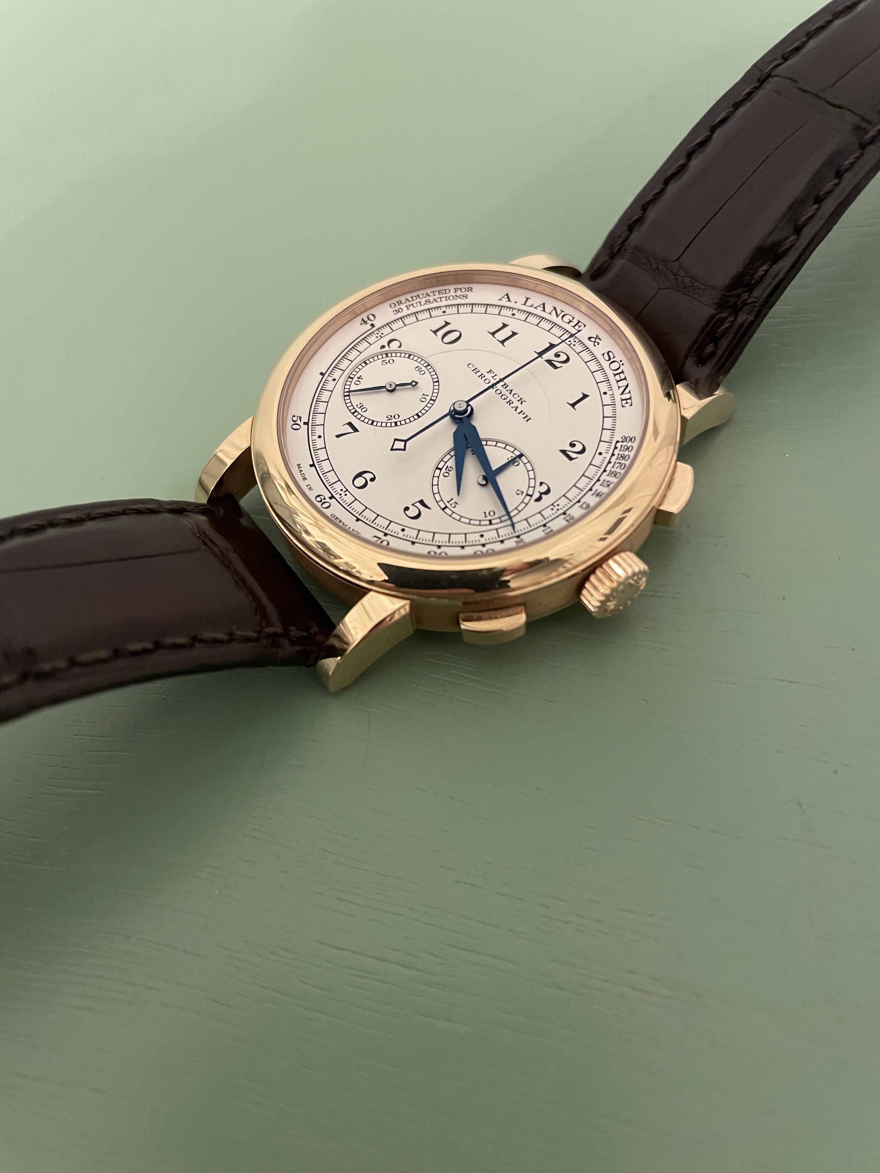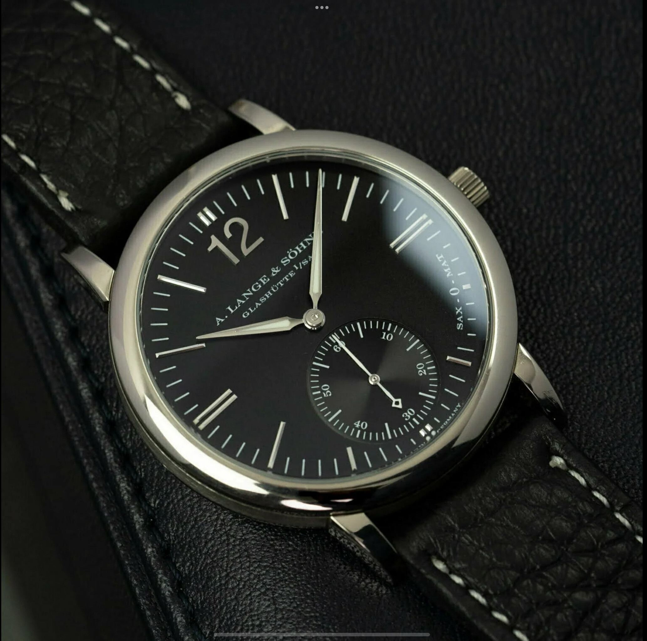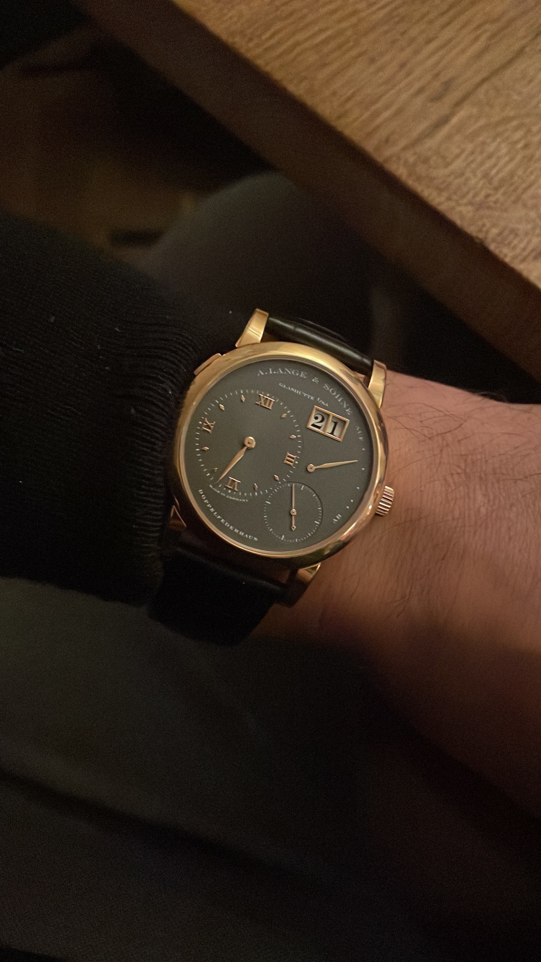 Dikke “anglage”, hand gravure, “german silver”, “black polishing”, perlage, geblauwde schroeven, Glashütte striping. Allemaal te zien, tussen de stofjes en zo door . Net als de “diepte” van het uurwerk.