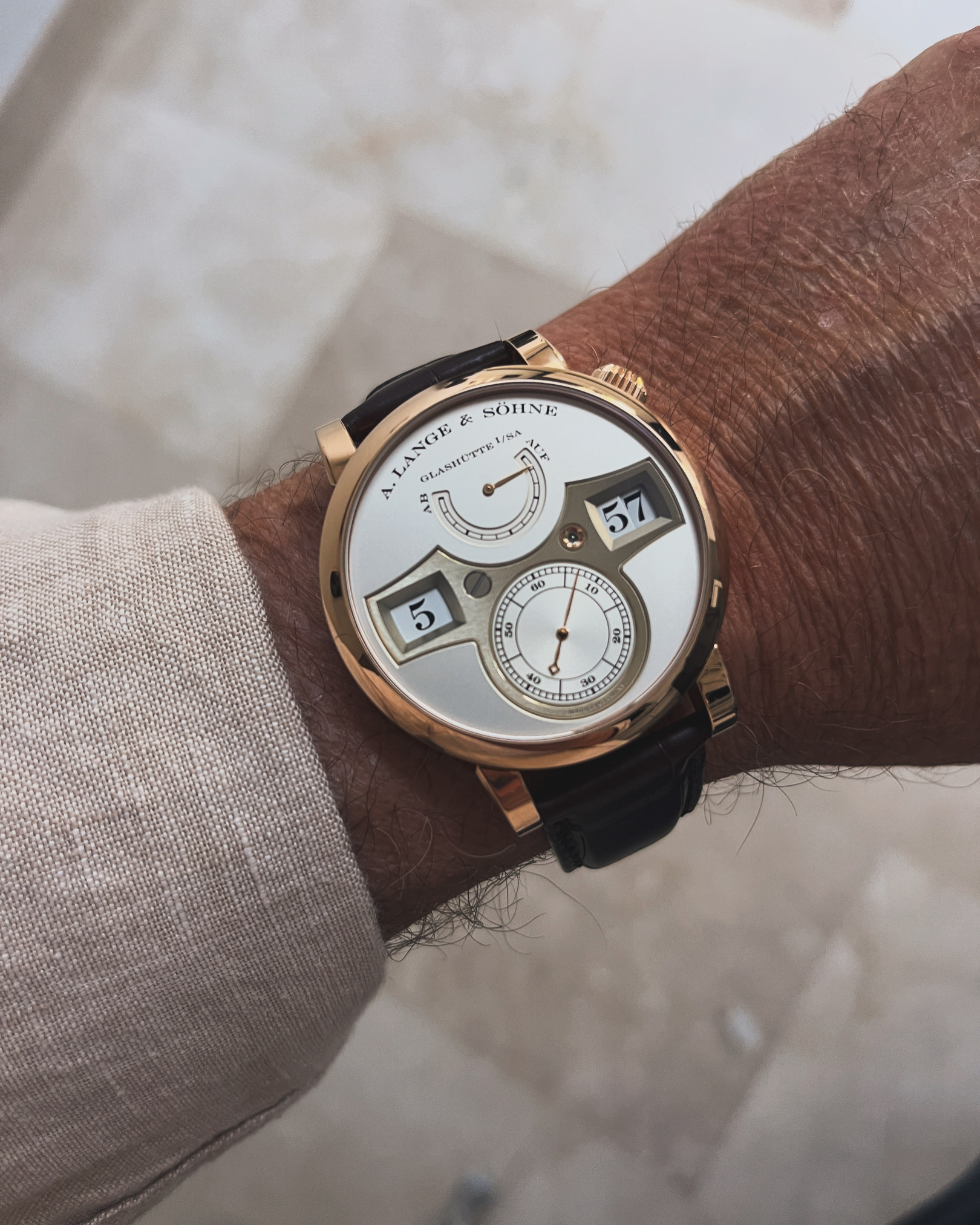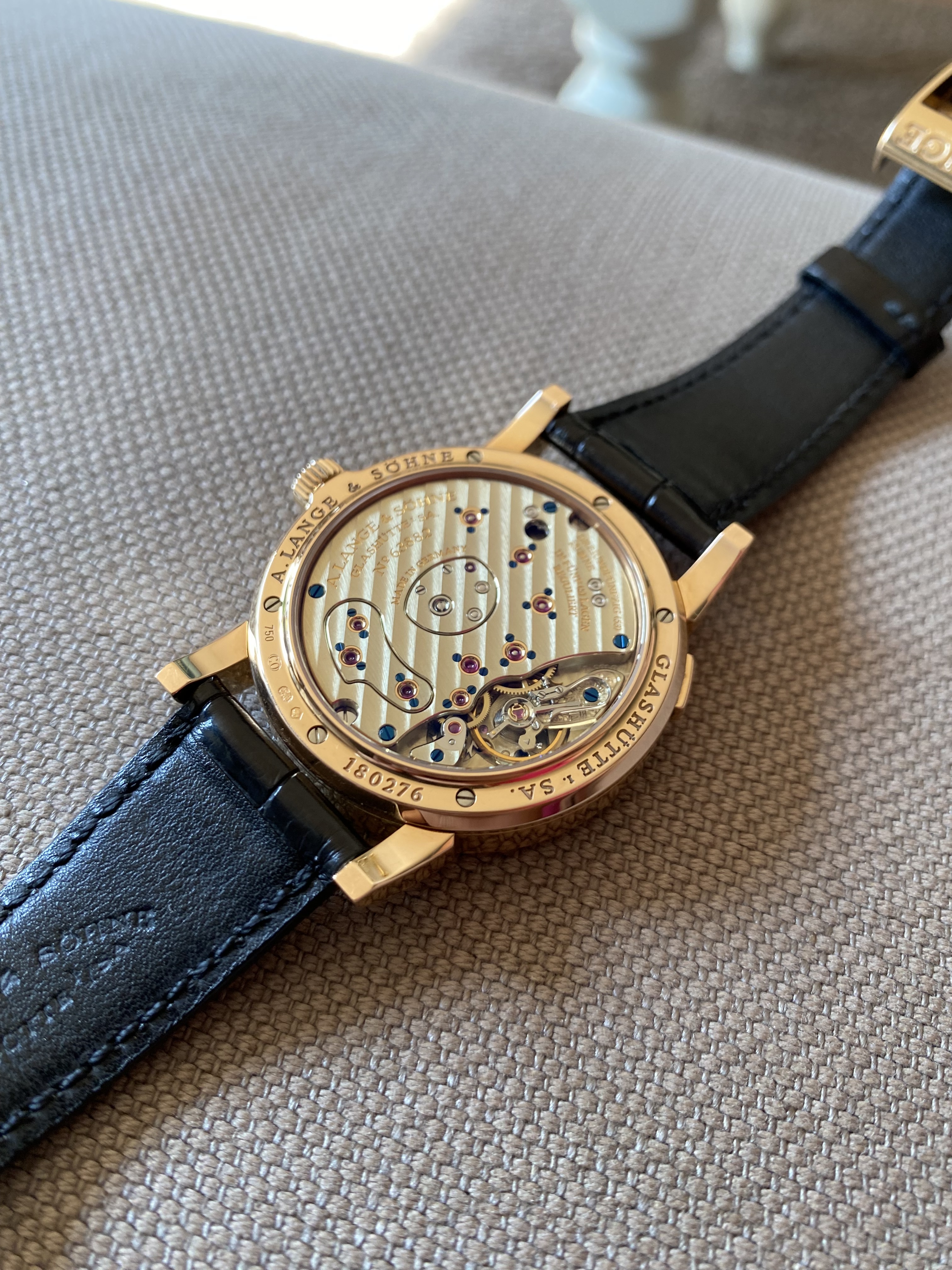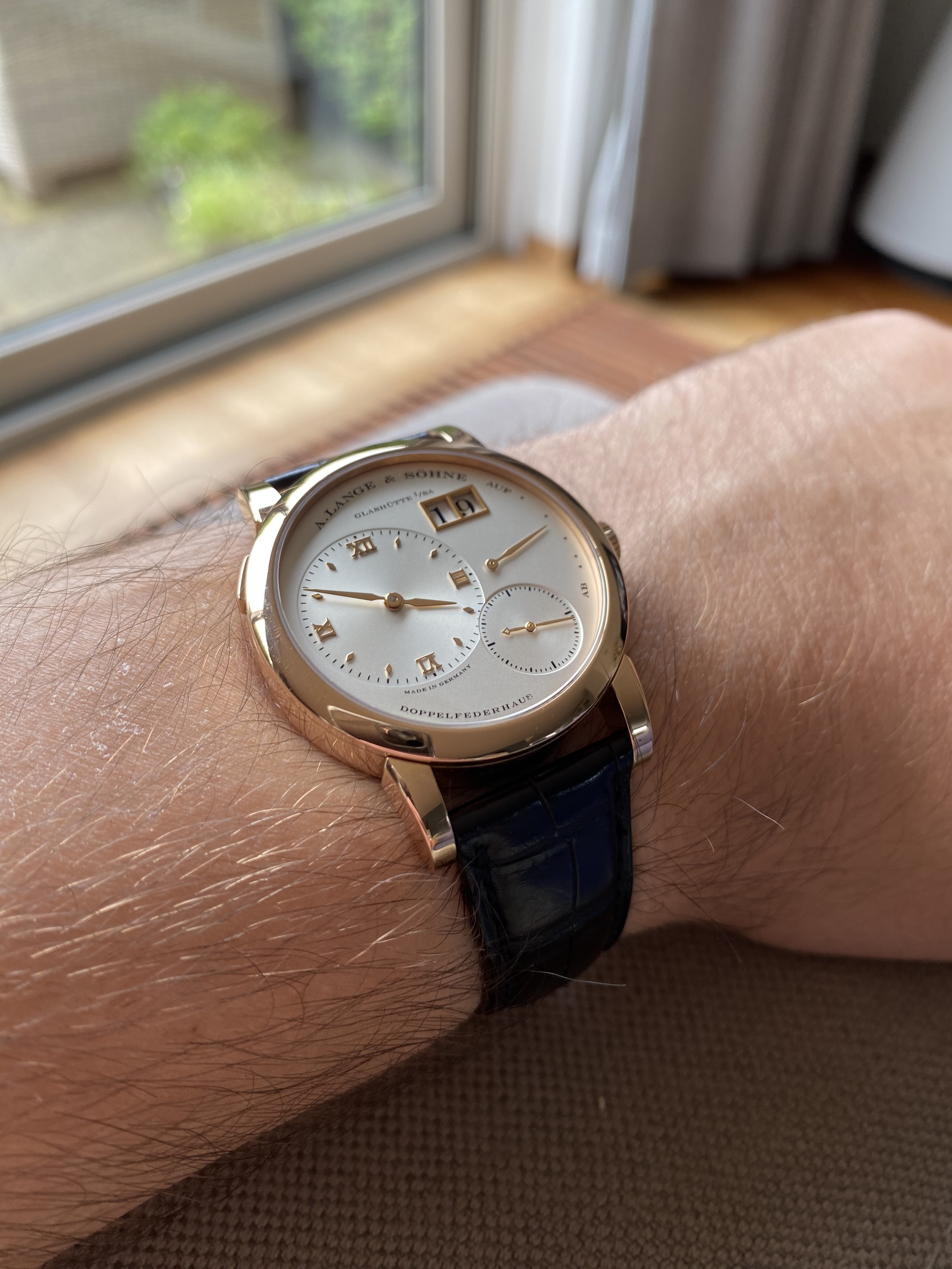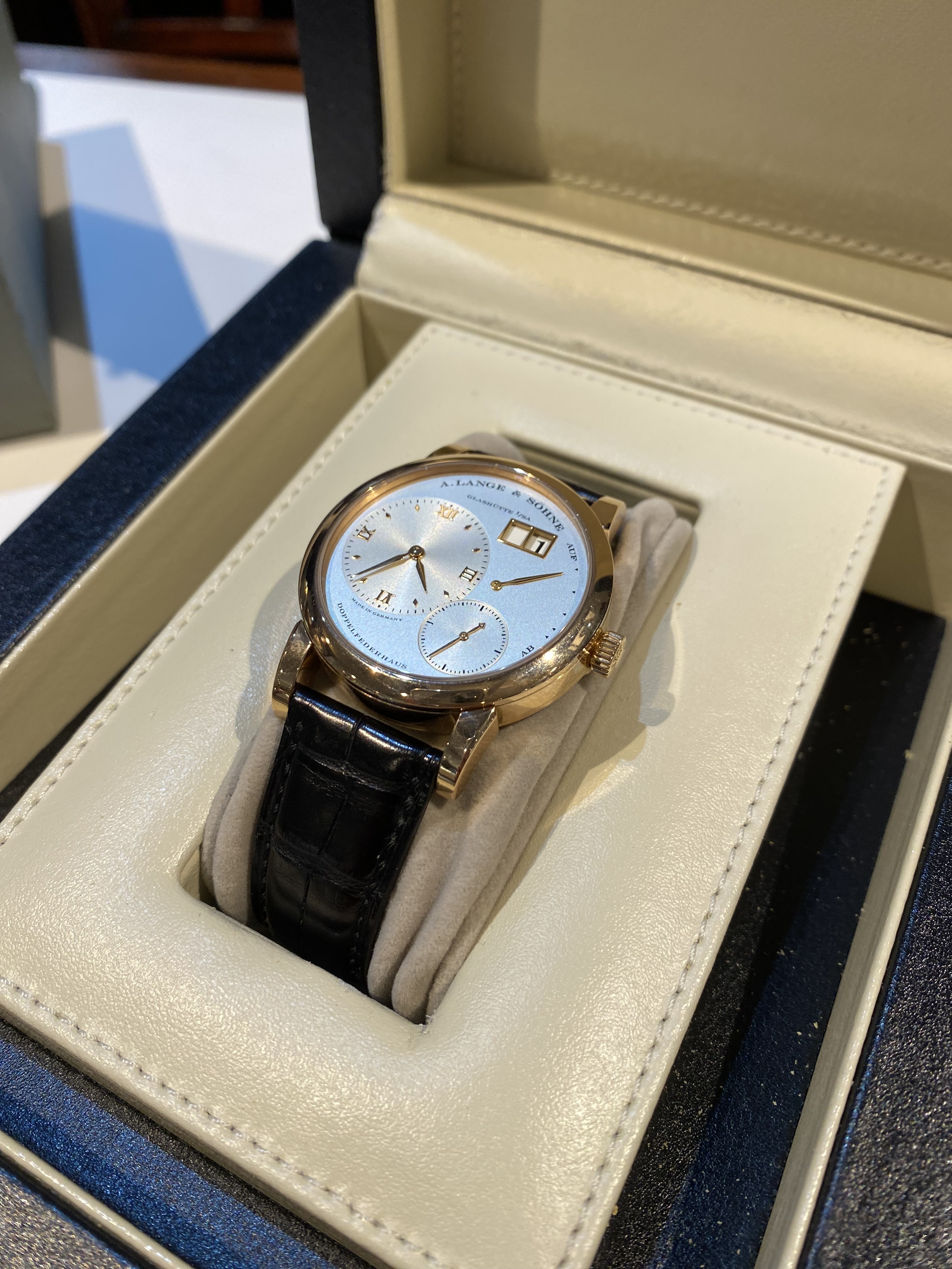 Heb vandaag de keuze gemaakt om de Lange 1 aan te schaffen. Was nogal een keuze. Is niet niks wat je afrekent. Heb uiteindelijk een deal met de (zeer vriendelijke, betrouwbare en kundige) juwelier kunnen maken om enige onzekerheden weg te halen. Het horloge is nog niet ge-serviced en daar hangen risico’s aan. Volgend jaar ga ik hem voor een full service beurt op laten sturen naar Lange.