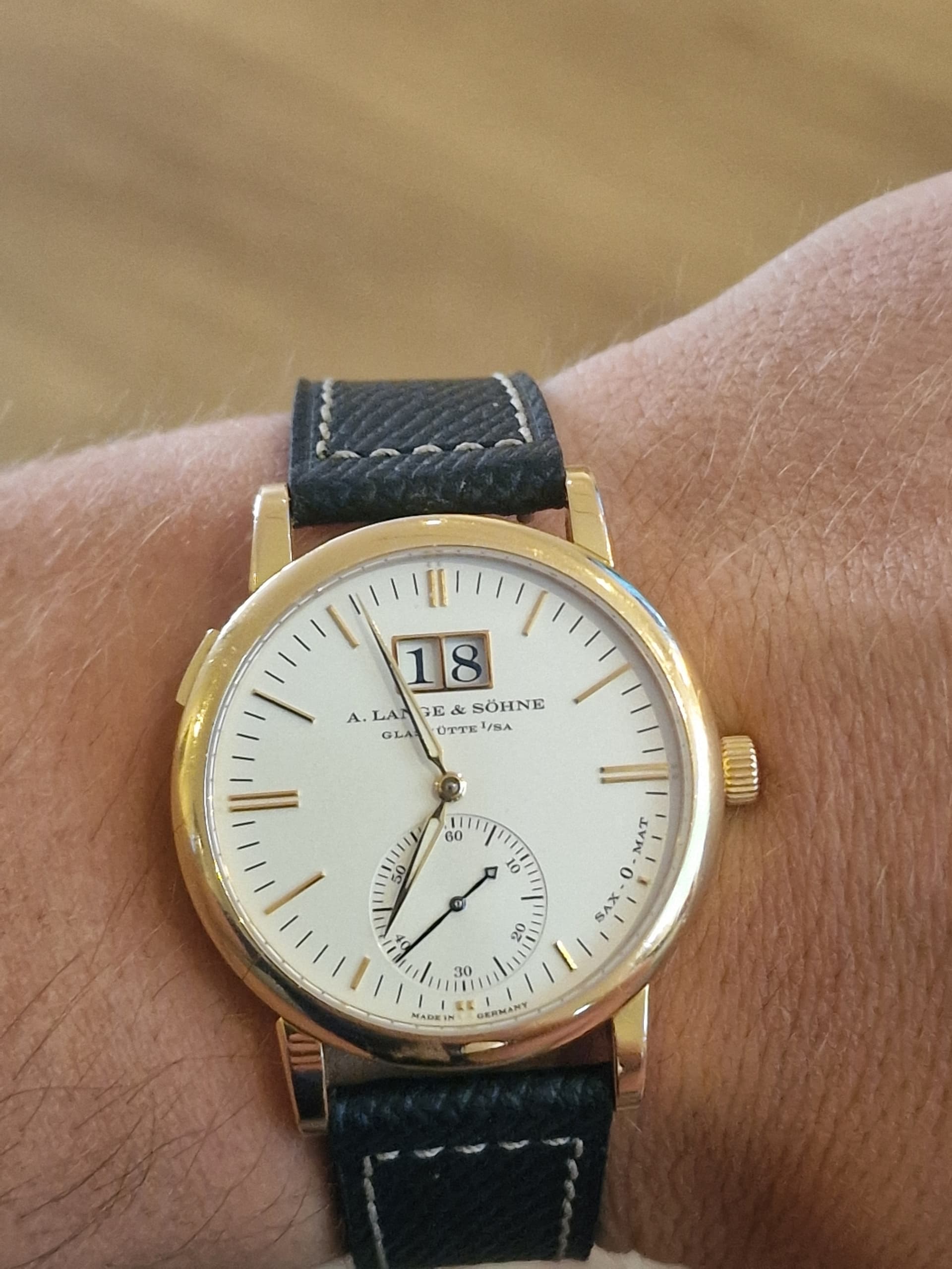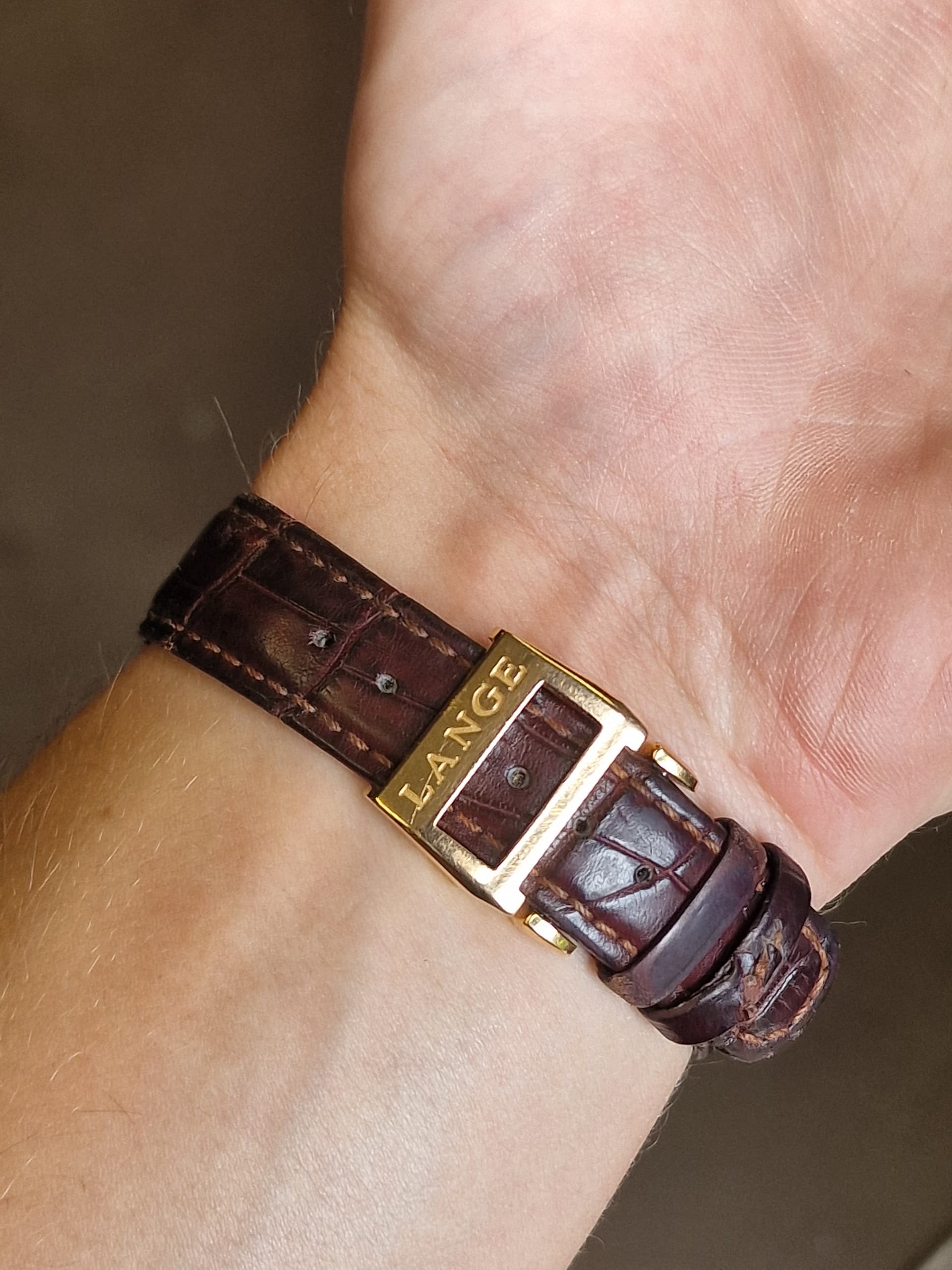 Met een blauw leren bandje van Fratello. Mooi voor de afwisseling maar ik verlangde toch snel terug naar de Lange-croco.