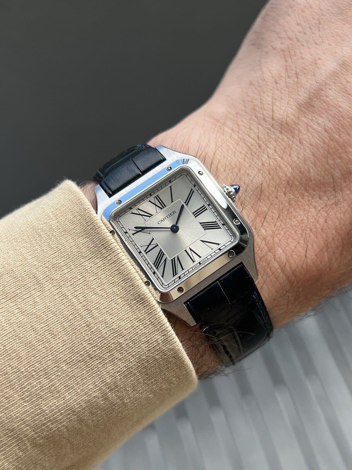De andere kandidaat zou voor mij inderdaad de Santos Medium of de Santos Dumont large zijn. Dat zijn echt fantastische horloges. Kunnen altijd. Dress up, dress down, maakt niet uit.