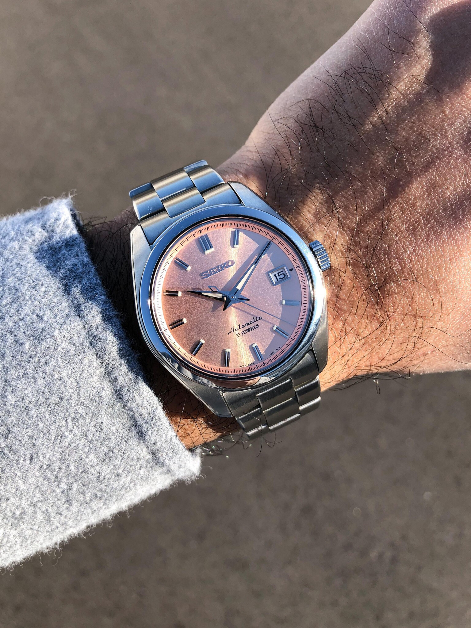 Wat dacht je van een Baltic met zalmkleurige wijzerplaat? Binnen het budget en geschikt voor speciale gelegenheden maar het betreft wel een horloge van een microbrand.