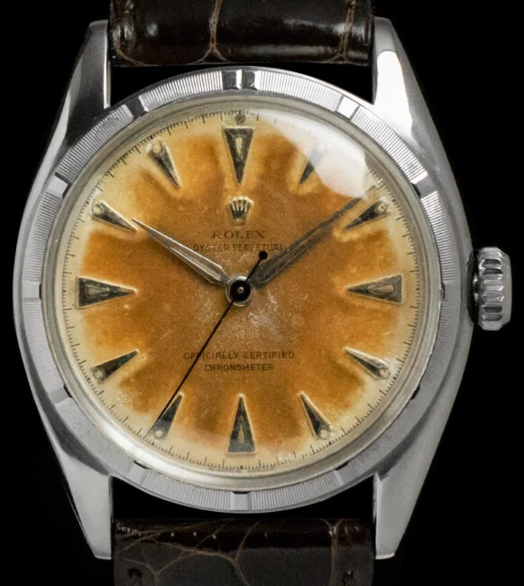 Dit soort “aanslag” kan ook verkleuring door Radium zijn. Vanuit de wijzers (bij 2e foto) of soms ook als laagje gesmeerd op een wijzerplaat. En beige kan natuurlijk ook oorspronkelijk dial kleur zijn!