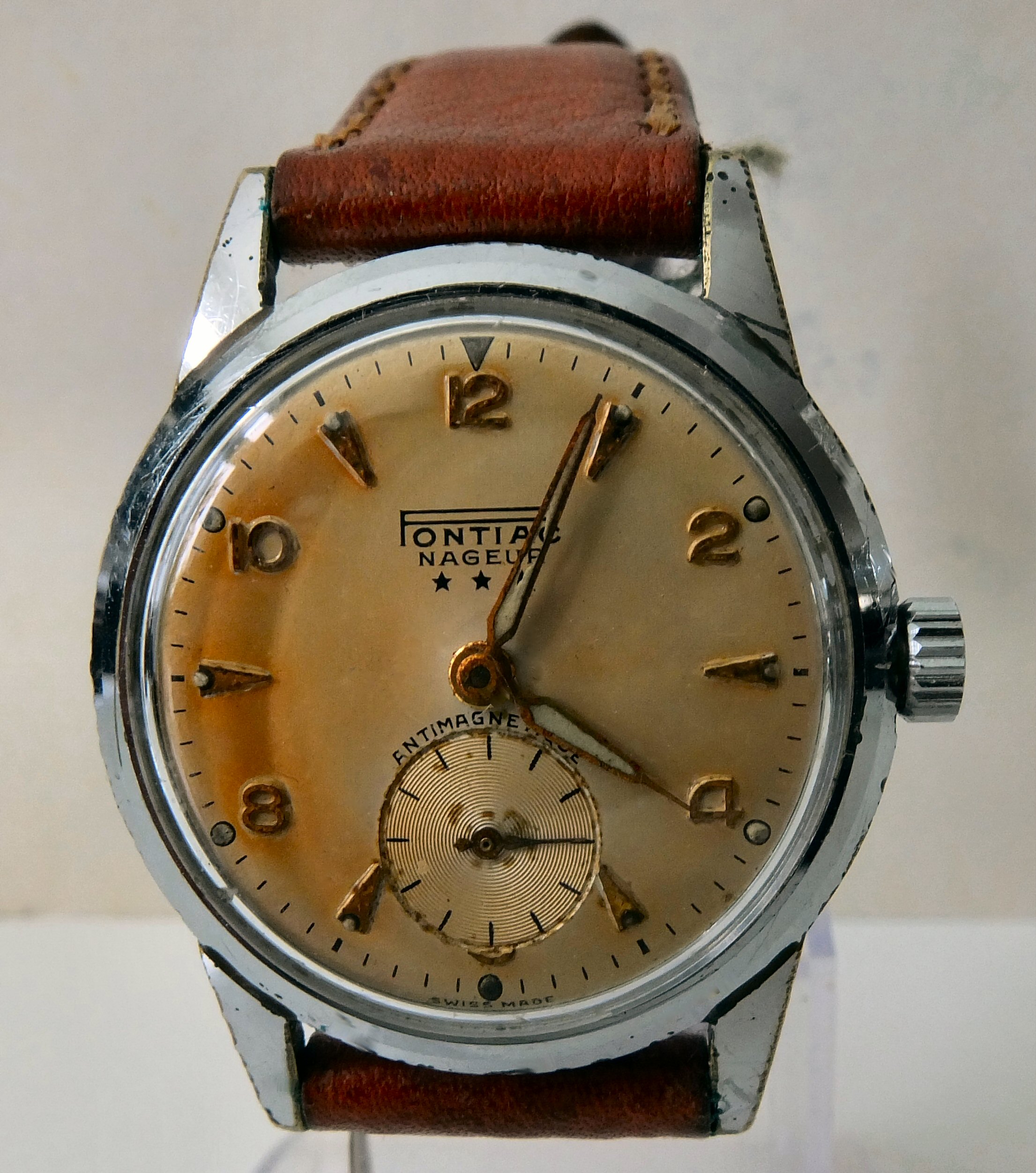 Alles kan, Maar in dit geval (de Pontiac) is er geen verkleuring direct bij de groenige lume (radium?) puntjes bij de uurmarkers. En inbrandvlekken van de wijzers hebben dan ook de vorm van die wijzers, met name als het horloge met actieve radium op de wijzers lange tijd ergens ongebruikt en dus stilstaand heeft gelegen.