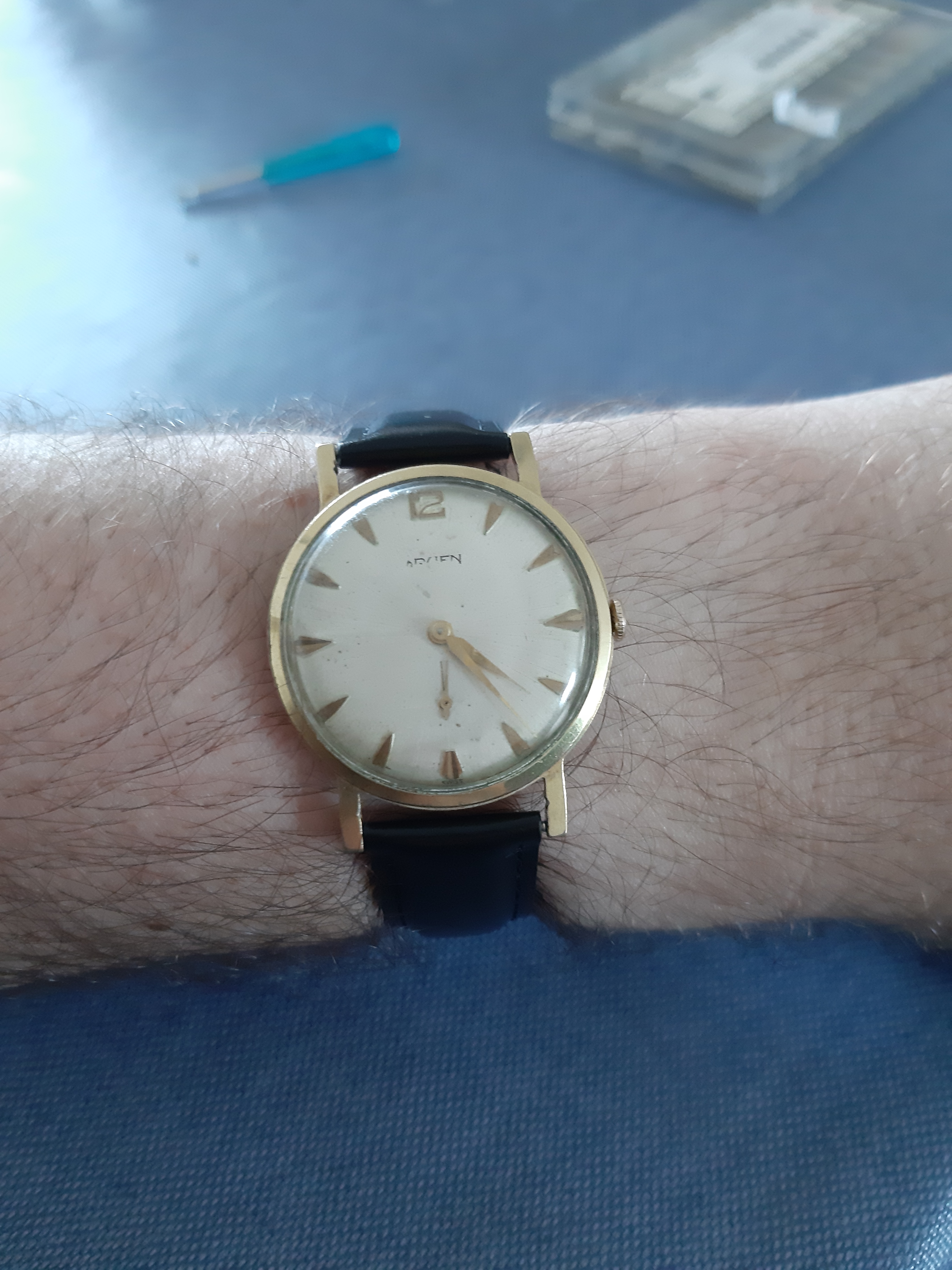 De gruen 510 (het eerste horloge wat James Bond in de films droeg) is werkend binnen. Ik twijfel nog over het bandje (die is me te glad en te kort) en of ik de dial tzt ga vervangen of als nieuw ga laten maken.