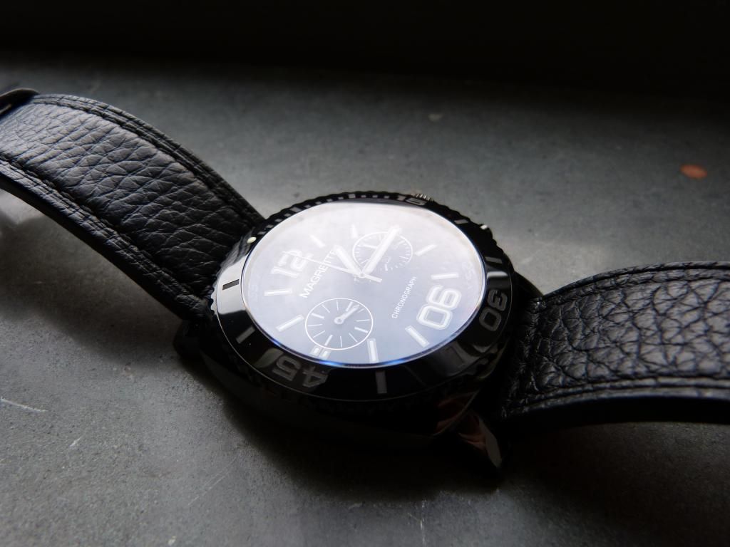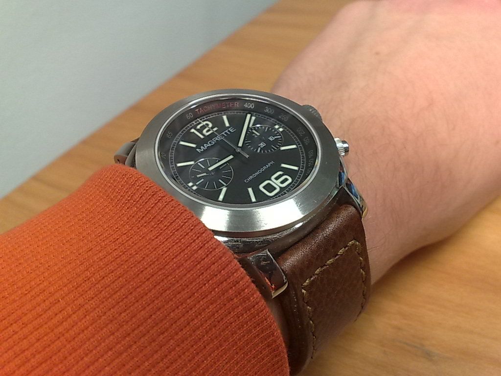 De draagbaarheid viel me alles mee, ik ben uitgerust met wat smalle polsjes waardoor ik had verwacht dat het nog spannend zou worden hoe het geheel te dragen was. Wat ik ergens wel vreemd vind is dat de horloges zo dik zijn. Over het algemeen is een handopwinder wat minder dik dan automaten was altijd mijn opvatting. Dat zal natuurlijk wel verschillen per uurwerk en bovendien past het goed bij het stoere, robuuste karakter van magrette. Helaas was de dstrap niet voor mijn pols gemaakt, want hoewel het een heerlijk dik maar soepel bandje is, zit mijn pols-maat precies ergens tussen de standen. Niet verschrikkelijk, want het standaard-magrette bandje is ook al prima. Bovendien vind ik die rode binnenkant echt heel erg gaaf.