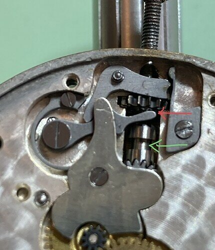 Vervolgens heb ik 3 keer de brug (en setting mechanisme) opnieuw moeten monteren. Het haakje in de veerton bleek niet goed genoeg te pakken. Uiteindelijk het lipje van de veer maar om de arbor heen gebogen (zoals ik bij andere uurwerken gezien heb). En de werking buiten de brug getest door deze te gebruiken (pin vice):