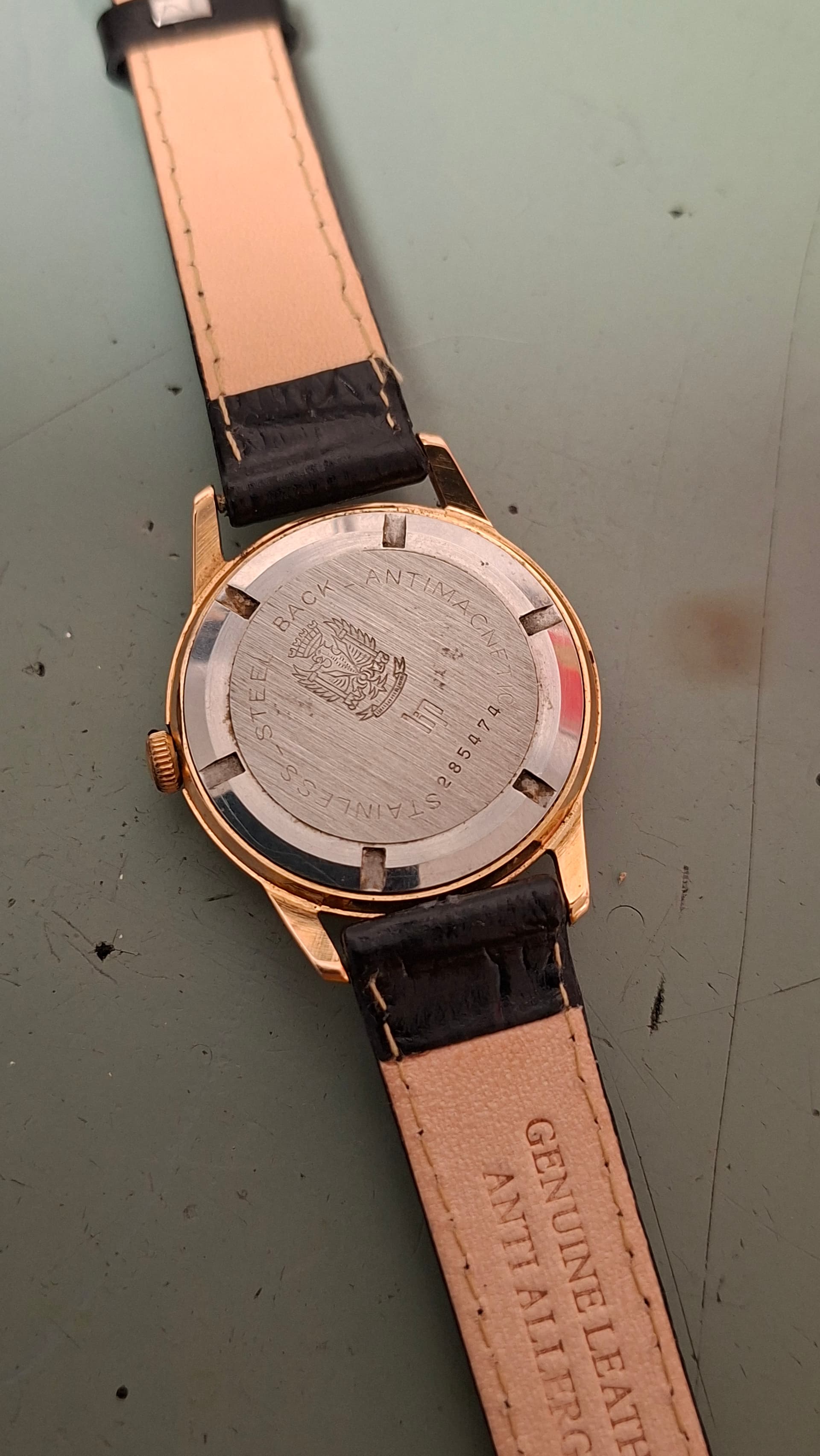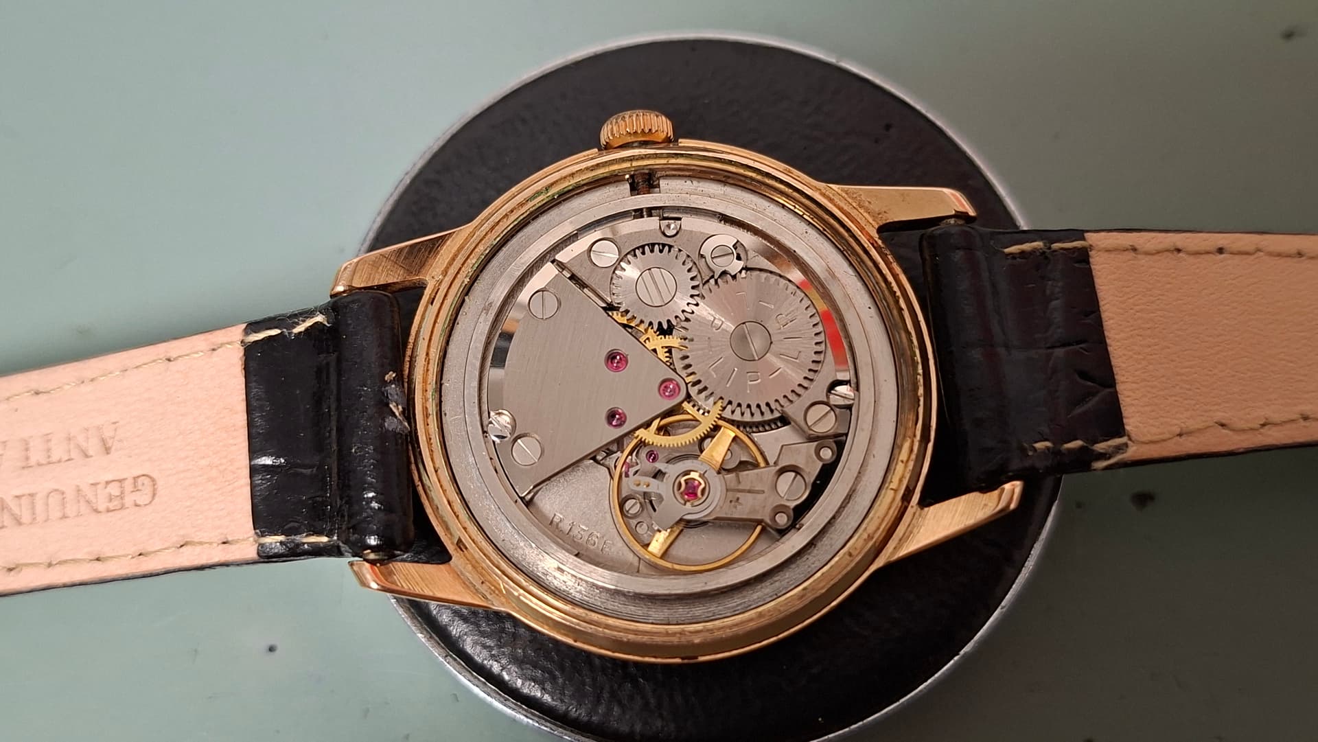 Tot ik dit exemplaar (on-line) tegenkwam bij een particuliere reparateur in Frankrijk. Het is een horloge van rond 1960 met een R136E kaliber. Mooi hersteld en loopt keurig. Een kleine smet was een klein stukje kast dat onder de kroon bleek afgebroken. Niet vermeld door de verkoper (en volgens hem al zo voor de restauratie). Maar het is niet hinderlijk en bij het dragen onzichtbaar. Dus een mooi groen bandje erop en fijn van genieten.