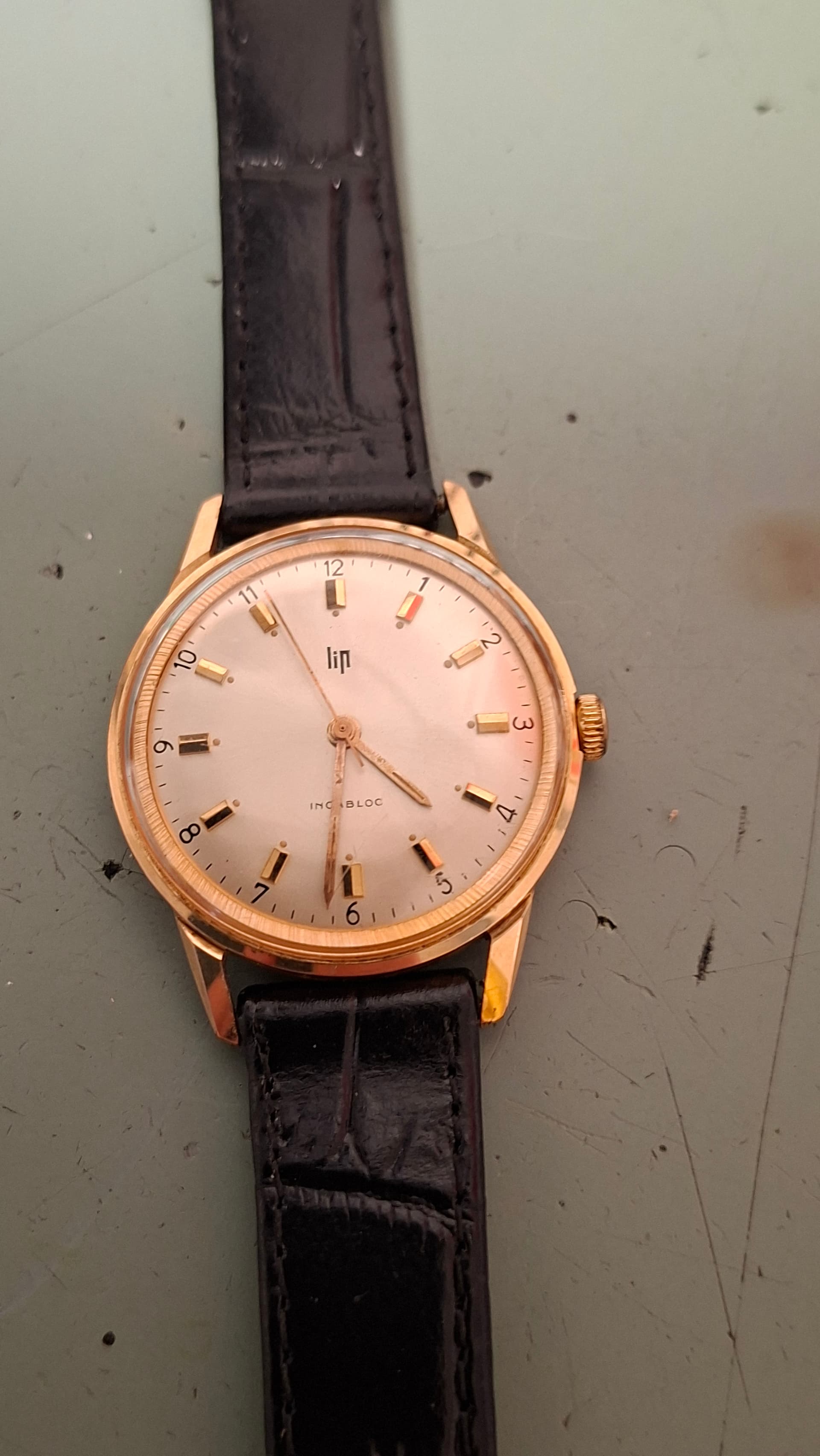 Dat bliksempje is dan wel weer bekend. Dat komt van de Lip Electronic. Dat vind je op de horloges met een electrisch mechanisme, waarmee Lip pionierde vanaf 1952. Uiteindelijk kwam de Electronic in 1958 op de markt, een model dat later de naam General De Gaulle kreeg. Volgens mij komt het bliksempje later terug op elk model van Lip dat een electrisch mechanisme heeft. Maar dat laatste weet ik niet zeker.