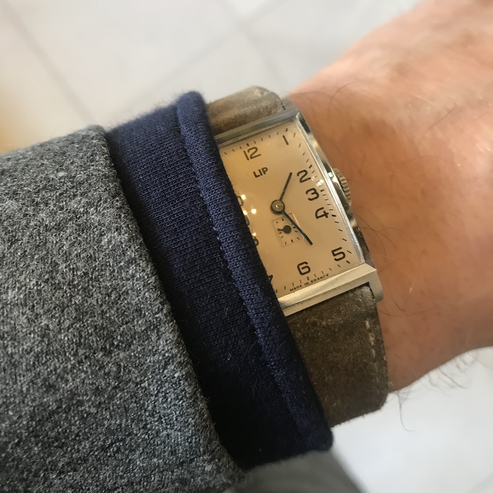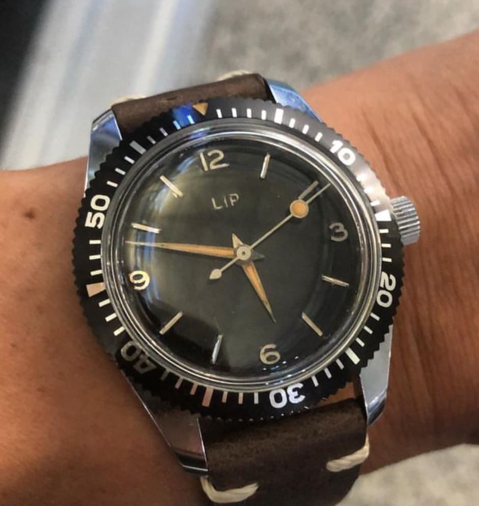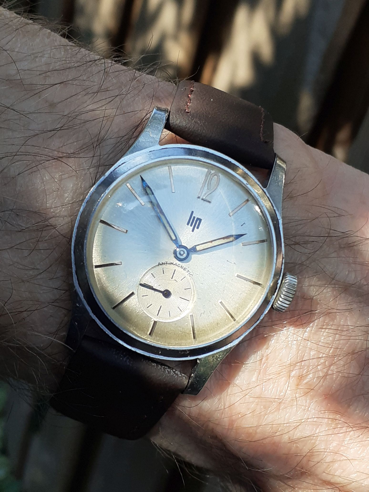 Dat bliksempje is dan wel weer bekend. Dat komt van de Lip Electronic. Dat vind je op de horloges met een electrisch mechanisme, waarmee Lip pionierde vanaf 1952. Uiteindelijk kwam de Electronic in 1958 op de markt, een model dat later de naam General De Gaulle kreeg. Volgens mij komt het bliksempje later terug op elk model van Lip dat een electrisch mechanisme heeft. Maar dat laatste weet ik niet zeker.