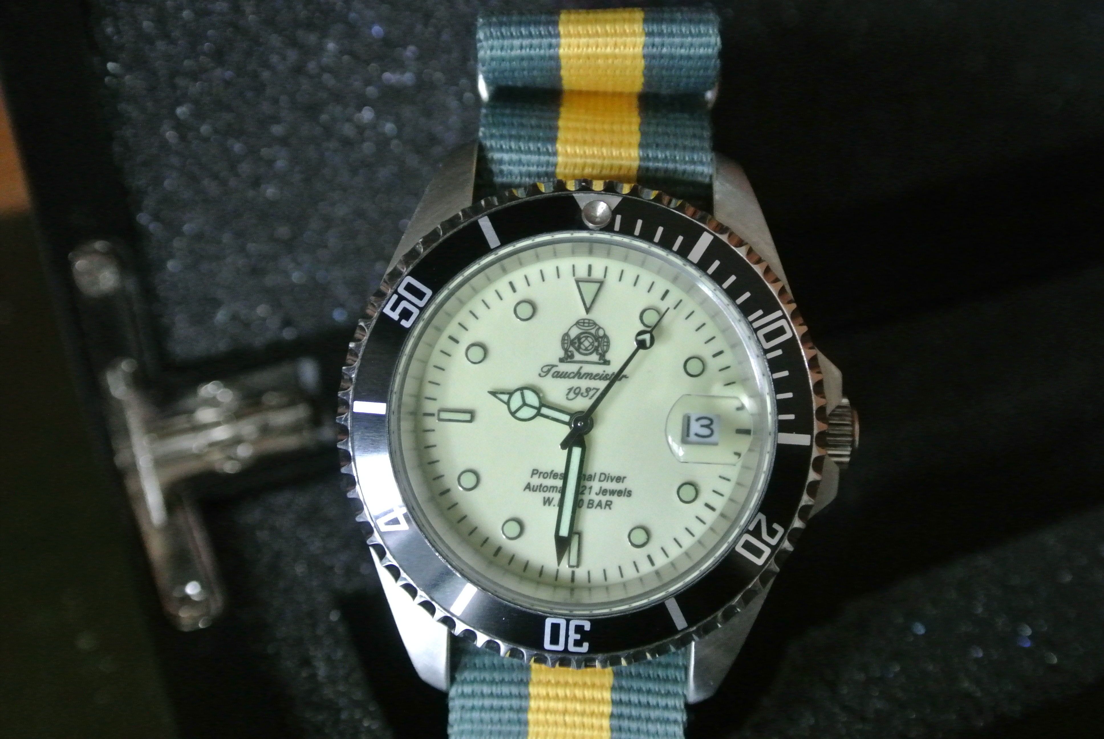 Een paar jaar geleden heb een Tauchmeister T0232 gekocht. Toen was ik nog niet zo met horloges bezig, maar ik ben er nu achter gekomen dat er veel mooiere gebruikt klokjes zijn voor het zelfde geld. Maar goed, dat tot daar aan toe.