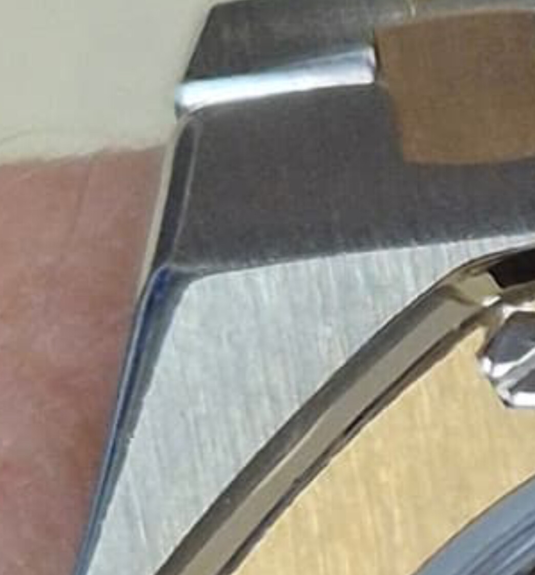 Op foto kijk je van kortbij, waardoor de ‘kop’ van het horloge groter lijkt en de band sneller wegdraait.
