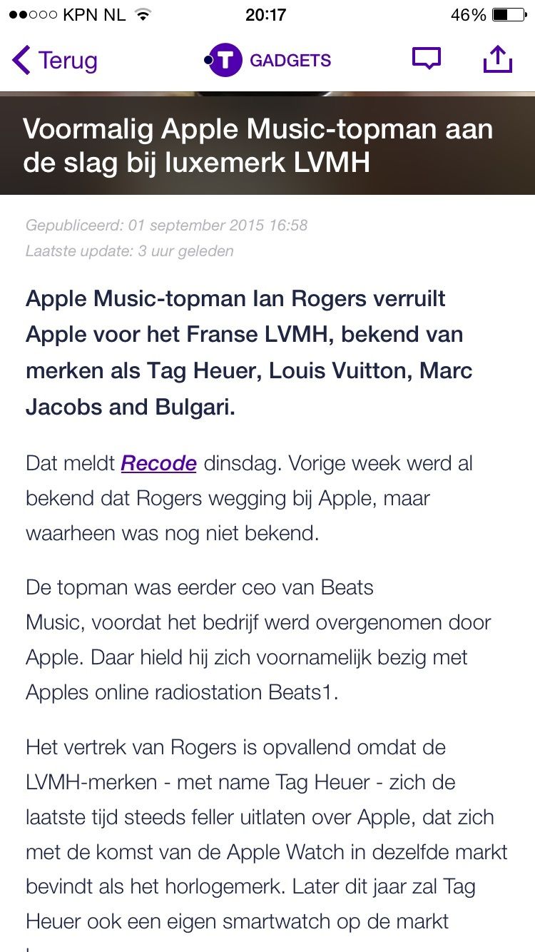 Opvallend bericht op Nu.nl over Ian Rogers die Apple verlaat om bij de LVMH groep te gaan werken aan waarschijnlijk de nieuwe smartwatch van Tag Heuer. Ik ben benieuwd!