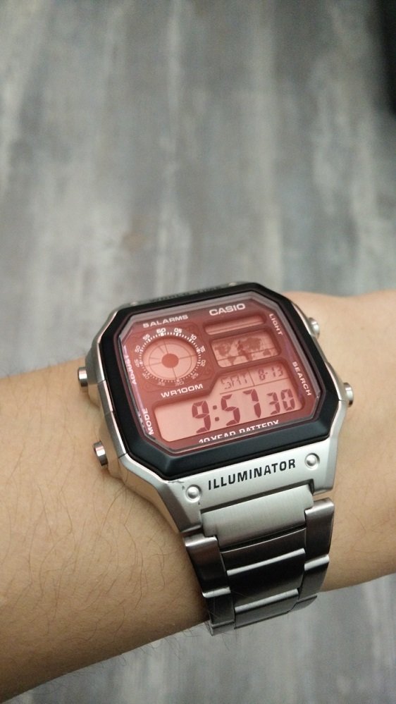 Ik had laatst m’n Casio “Redflection” om. De zonwering weerspiegelde in het plastic waardoor het een rode tint kreeg. Vind het wel mooi staan eigenlijk.