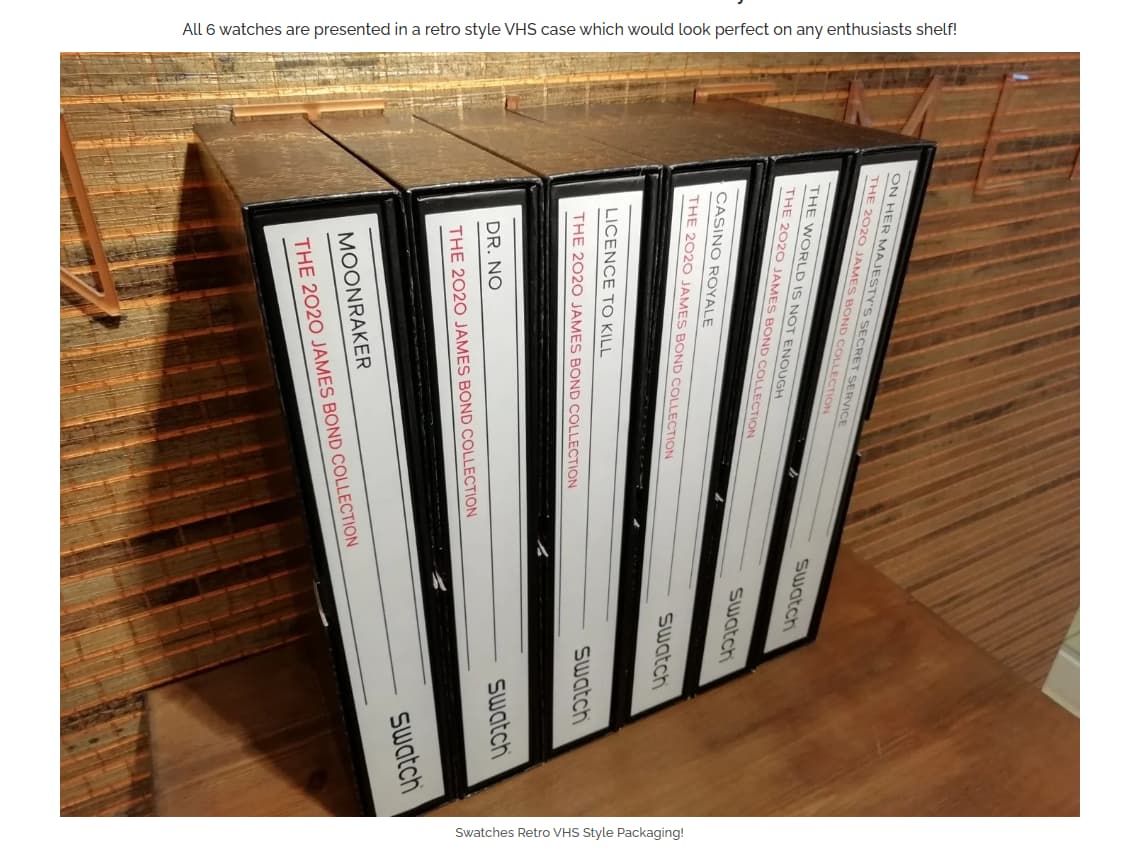 En hoewel ik het een heul tof idee vind mag ik wel opmerken dat de marketing boys wel de verpakking in de vorm van een VHS band / VHS band hoes linea recta gejat hebben van mijn favoriete Swatch 007 collectie.