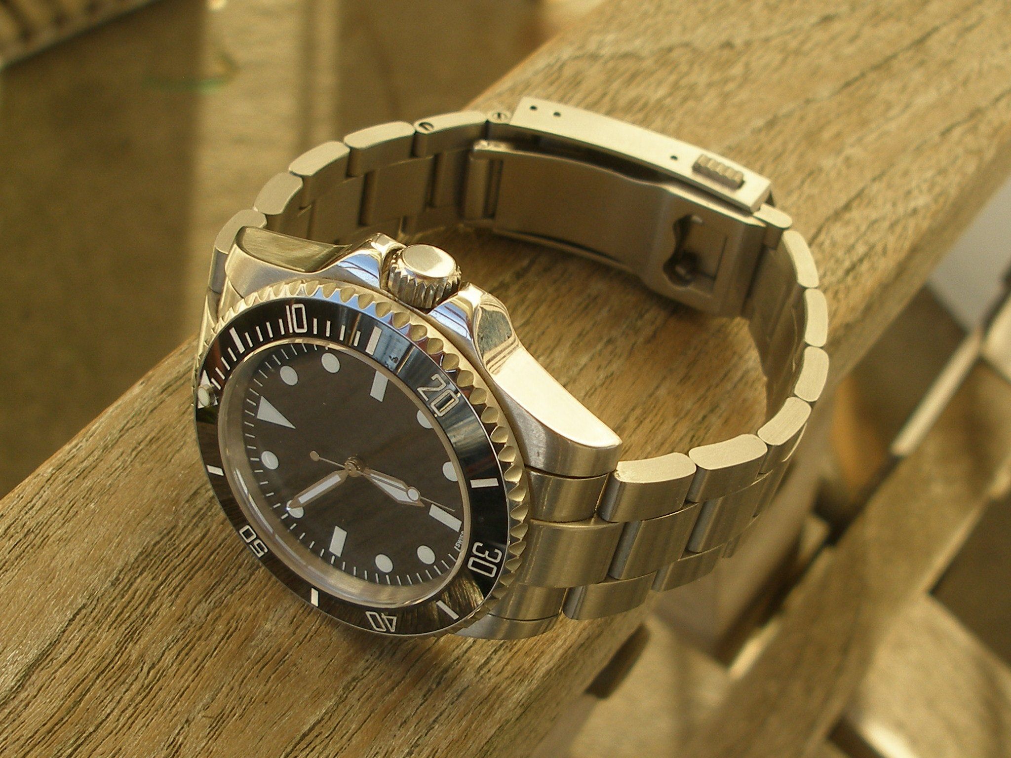 Deze komt van forumlid vierport. Parnis mod. hommage no-date. Bubbel weg gepolijst, datumwiel verwijdert met een nieuwe strakke wijzerplaat, ceramische bezel, geschroefde kroon, geschroefde schakels en extra diversextention, automatic zeer goed lopend met een lange gangresreve voor nog geen 100 euroos. Een betere vakantieklok kun je je niet wensen toch ?