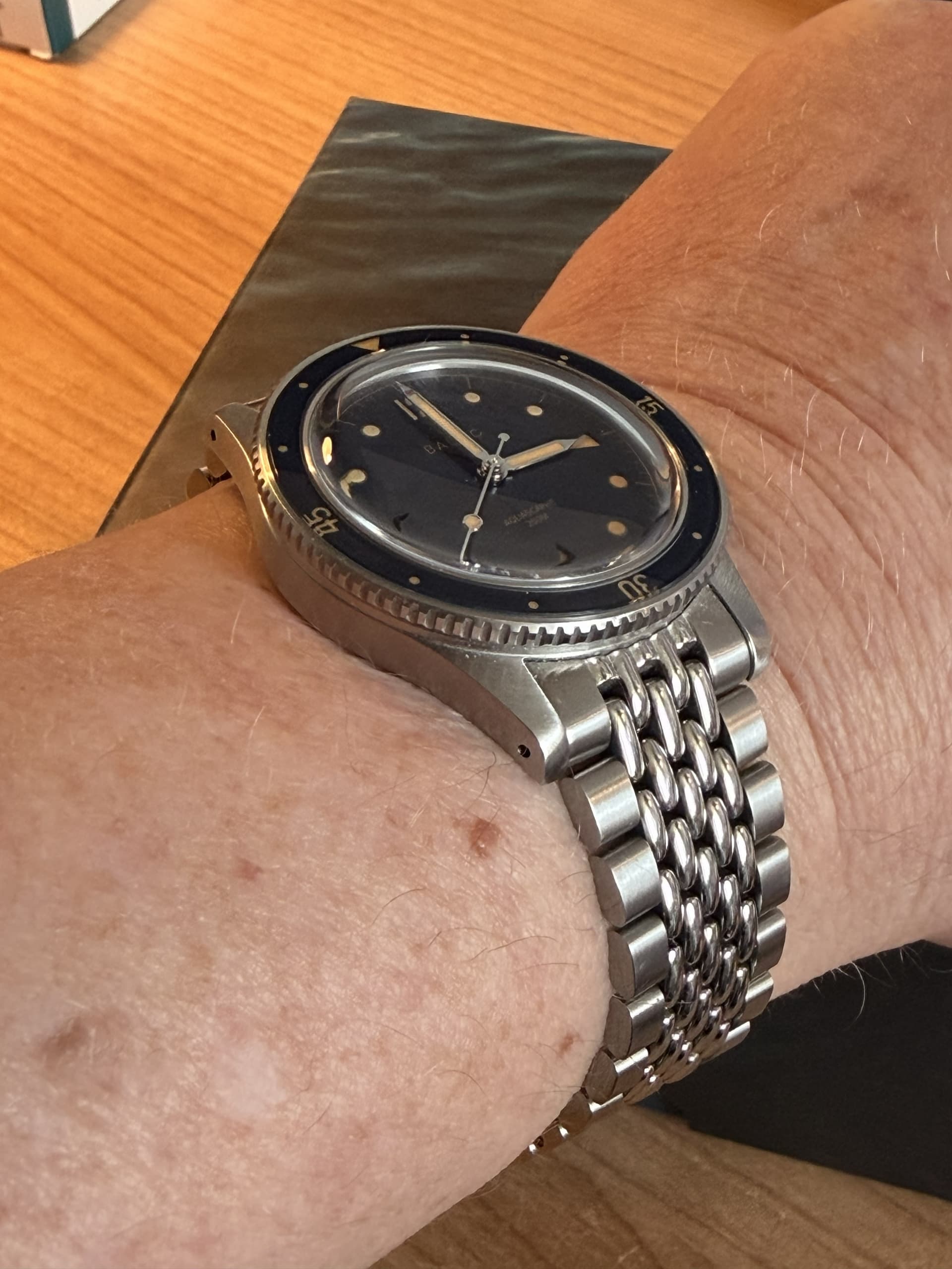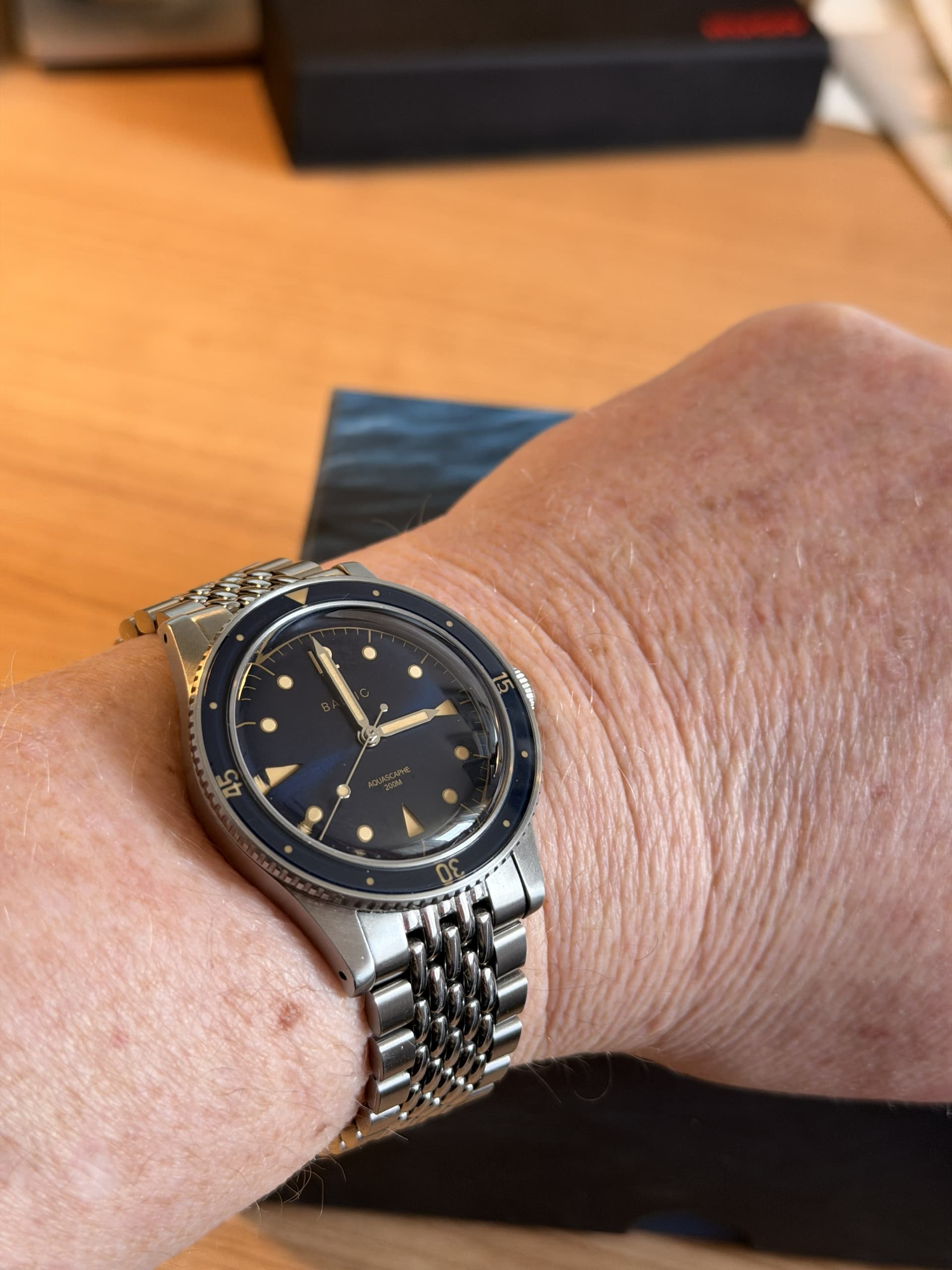 Omdat ik wat automaten wil verkopen om meer quartz modellen aan te schaffen ga ik mijn geliefde Baltic Aquascaphe te koop aanbieden. Hij is amper een jaar oud (mei 2025) en hij komt met zowel de BoR-bracelet (het nieuwe model, mét geschroefde links, trouwens!) en de ongedragen, originele Baltic rubberen band. Ik heb hem zelf in de showroom in Parijs uitgezocht dus doe er met enige pijn in het hart afstand van, en ik zeg er dus maar bij voorbaat bij dat ik er wel een marktconforme prijs voor wil. Anders blijf ik hem gewoon af en toe dragen.