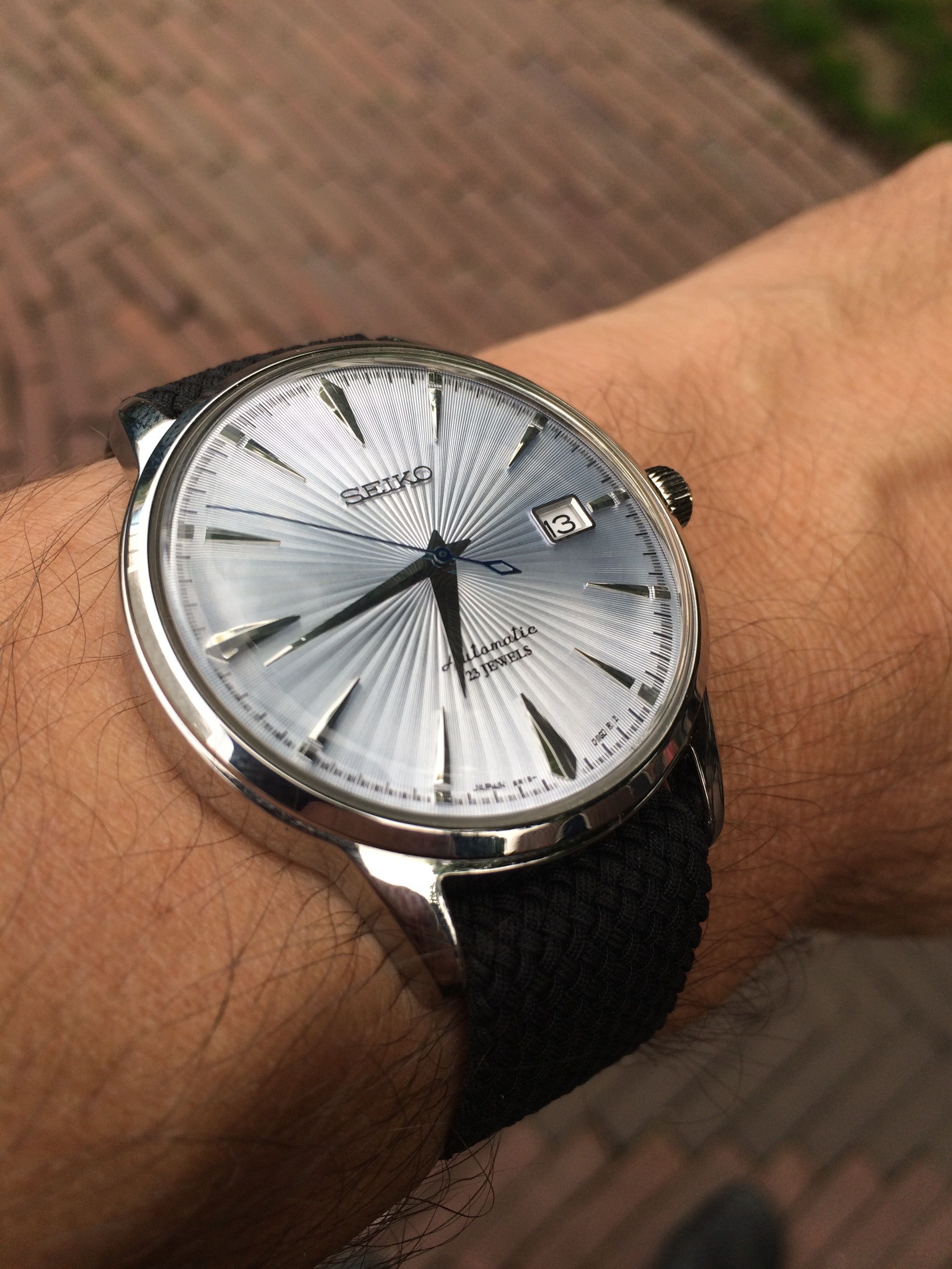 Deze week even bij de Horlogebandenspecialist binnengewipt en ik dacht dat ik 'm had, de perfecte band voor de Cocktail: De Rios1931 Imperial Genuine Alligator in cognac. Maar eenmaal op het horloge was de padding van 6,5 mm veel te dik. Leek wel of de Cocktail spierballen had gekregen!