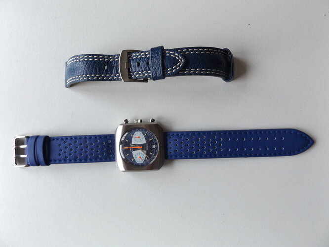 Het zoeken en monteren kostte wat tijd maar het resultaat is er ook naar! Beide bandjes zijn van een mooie, dikke kwaliteit (Piero Magli). De blauwe is zelfs waterproof (Lorica).