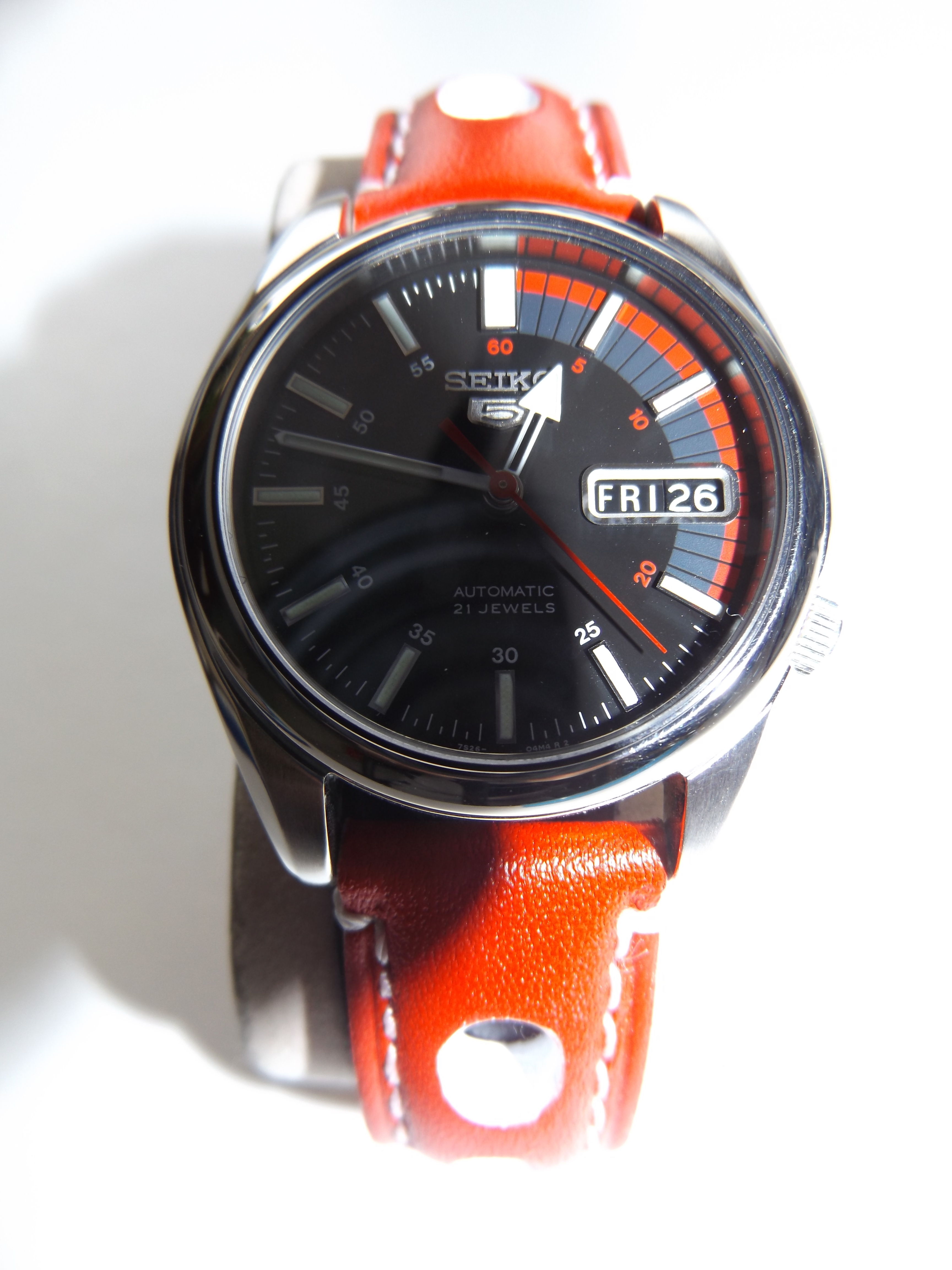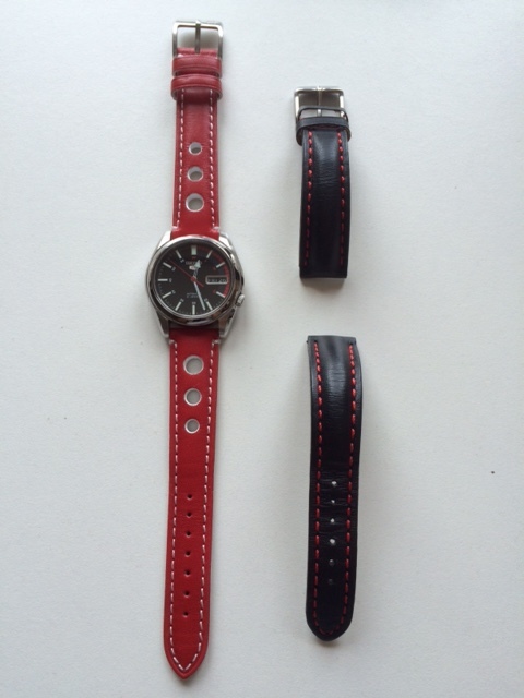 Tsja, wat bestel je dan voor de Seiko5 Racer? Een rood Racing bandje met wit stiksel dus: