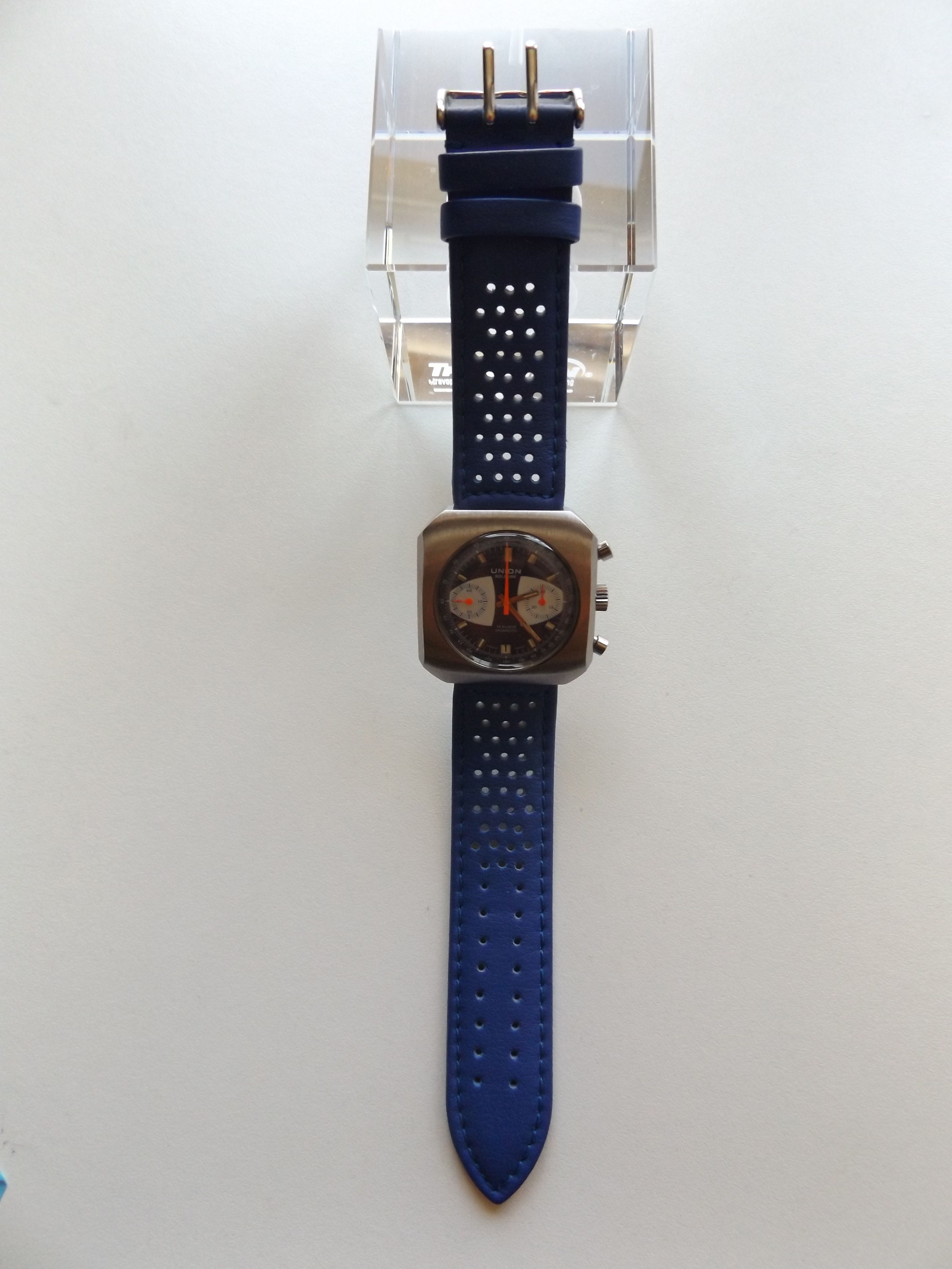Bij de Union liep ik tegen het probleem aan dat de lugbreedte 23 mm. is en vindt daar maar eens een Racing bandje voor⊠Veel gezocht maar niet gevonden. Bandje wat ik nu gemonteerd heb heeft volgens mij ook wel een connectie met autosport, weet echter niet hoe dit model/uitvoering heet. Door de gekromde springbars tussen de lugs, bleek het uiteindelijk mogelijk een 24 mm. brede band te monteren die door juiste montage van die schuine pinnen wat smaller wordt tussen de lugs en daardoor met enig "priegel"werk mooi past. Het oude bandje was maar 22 mm. en dit is een hele verbetering!
