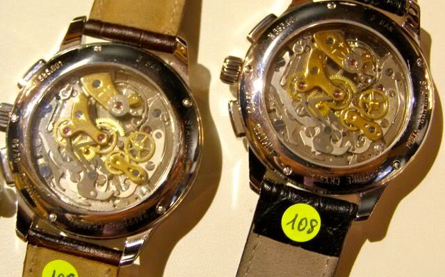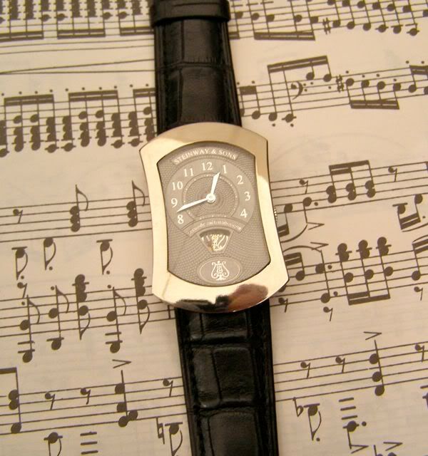 Steinway & Sons, de beroemde piana bouwer, doet nu ook aan horloges, en het model Seconde Metronomique is prachtig om te zien. De Metronoom is een apparaat dat de maat meetikt middels een wijzer die heen en weer slingert. Dit principe hebben ze ingebouwd in een extra venstertje. De sekondewijzer tikt heen en weer. Van links naar rechts en vervolgens van rechts naar links. Fascinerend om te zien. Jammer was het om te horlen dat het niet 1 wijzer was die heen en weer tikt, maar dat twee wijzers waren. De eerste verschijnt en gaat van links naar rechts, en verdwijnt dan. Zonder dat het met de ogen te zien is verschijnt er op dat exacte moment een wijzer aan de rechter kant en die loopt van rechts naar links. Dit gaat zo oneindig door. Bijzonder knap en leuk bedacht.