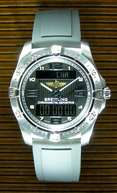 Breitling had haar stand weer bijzonder afgeschermd voor het gepeupel dat er volgens hun niets te zoeken had. Een foldertje over het nieuwe B01uurwerk is alles wat er te verkrijgen was. Achter een zichtvenster stond wel een Aerospace met een wijzerplaat die ik nog niet kende.