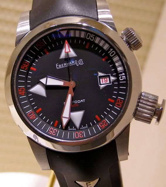 En de misser van de beurs was toch wel deze Eberhard Scofadat 500 (lelijke naam ook…) met op zich een leuke wijzerplaat, maar die totaal verpest word door een totaal misplaatste datum aanduiding. Bovendien lijkt het gezwel bij de 4 ook nergens op.
