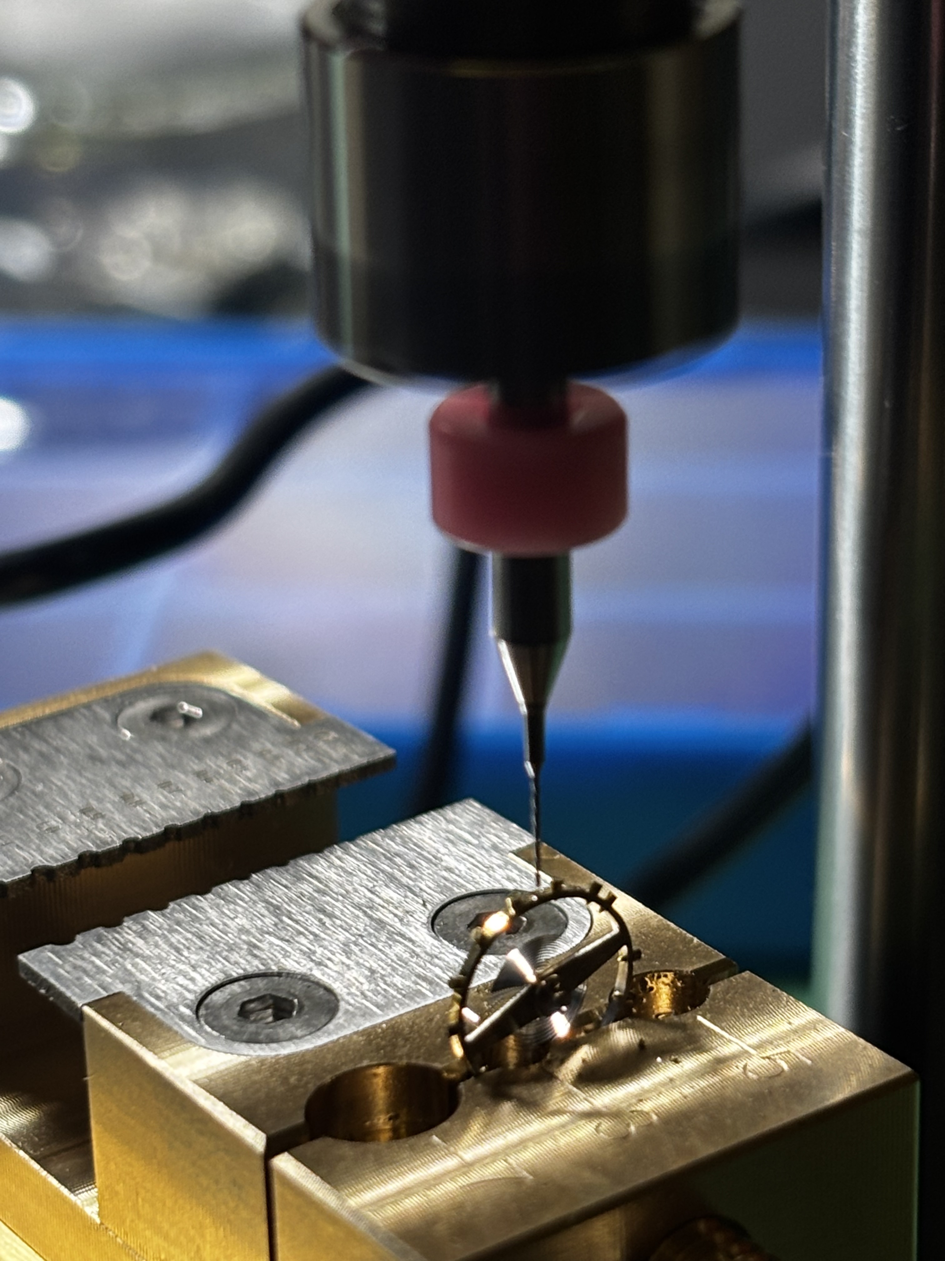 Hier zit een andere spankop op en kruistafeltje bij om kleinere onderdelen in te spannen.