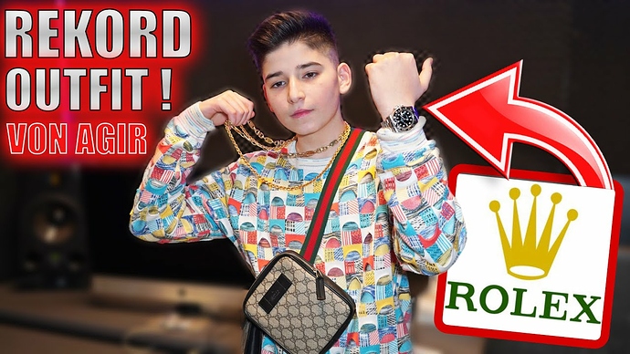 Hier heb je de Duitse rapper Agir met een Rolex GMT Gouden kettingen en dure Gucci kleding. Hij is 15 jaar oud eh.