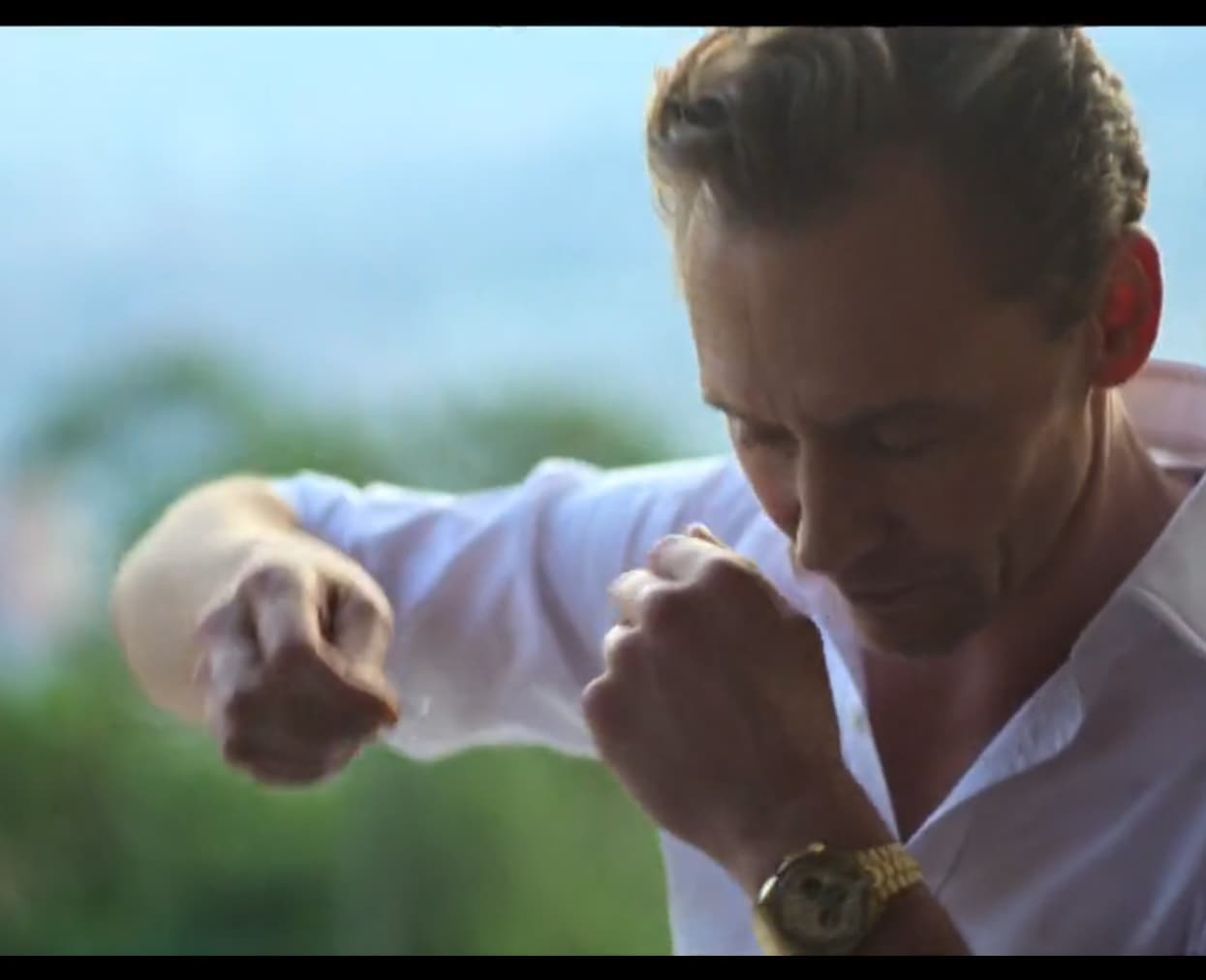 Beetje een wazige foto, maar het lijkt erop alsof Tom Hiddleston in het nieuwe seizoen van The Night Manager een gouden Omega Speedmaster draagt: