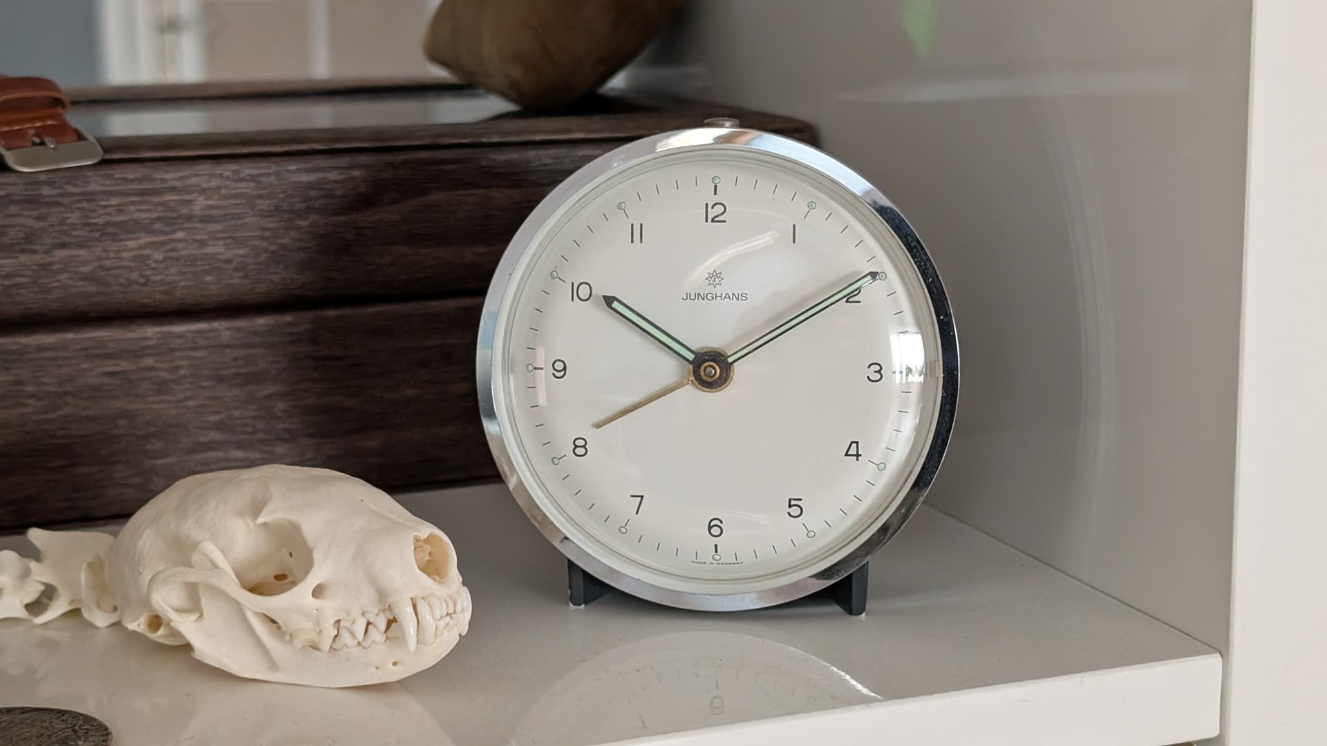 Ik verzamel zelf geen klokjes; dit Junghans reiswekkertje heb ik geërfd en eerlijk gezegd zat ik er niet echt op te wachten. Mijn zorgen begonnen pas toen ik hoorde dat er in klokjes van vóór circa 1960 mogelijk radium verwerkt kan zijn. Om die reden overweeg ik serieus om het klokje uit voorzorg gewoon weg te doen. Het stond al die tijd achterin een kast, totdat ik eraan dacht vanwege die mogelijke aanwezigheid van radium.
