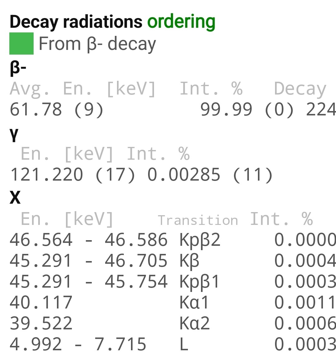 Halveringstijd ca. 2,6 jaar. Straalt hoofdzakelijk laag energetische beta straling uit wat niet eens door 1mm dik plastic heen komt dus meten met een GM teller in een plastic kastje is onmogelijk.