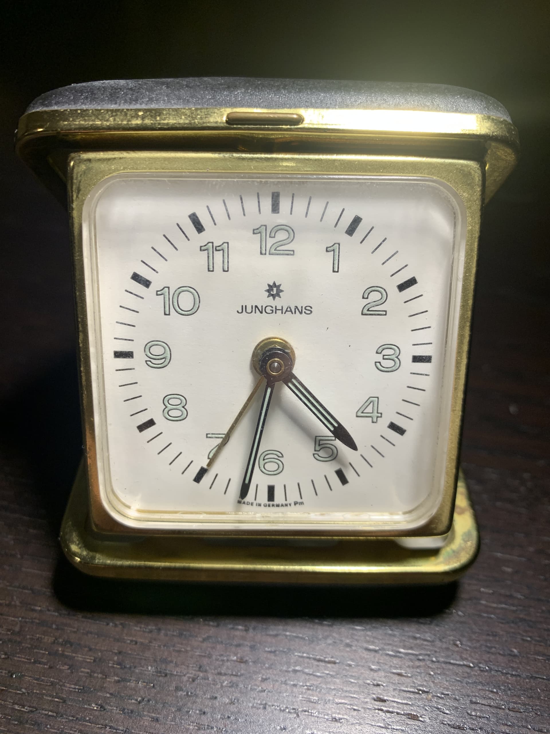 Ik heb onlangs een vintage Junghans reiswekker geërfd, vermoedelijk uit de jaren '50 of '60. Het klokje heeft een messingkleurige behuizing en een witte wijzerplaat met zwarte cijfers. Onder de 12 staat het Junghans-logo met de ster. Nu vroeg ik me af: is het mogelijk dat dit model nog radiumverf bevat op de wijzers of cijfers?