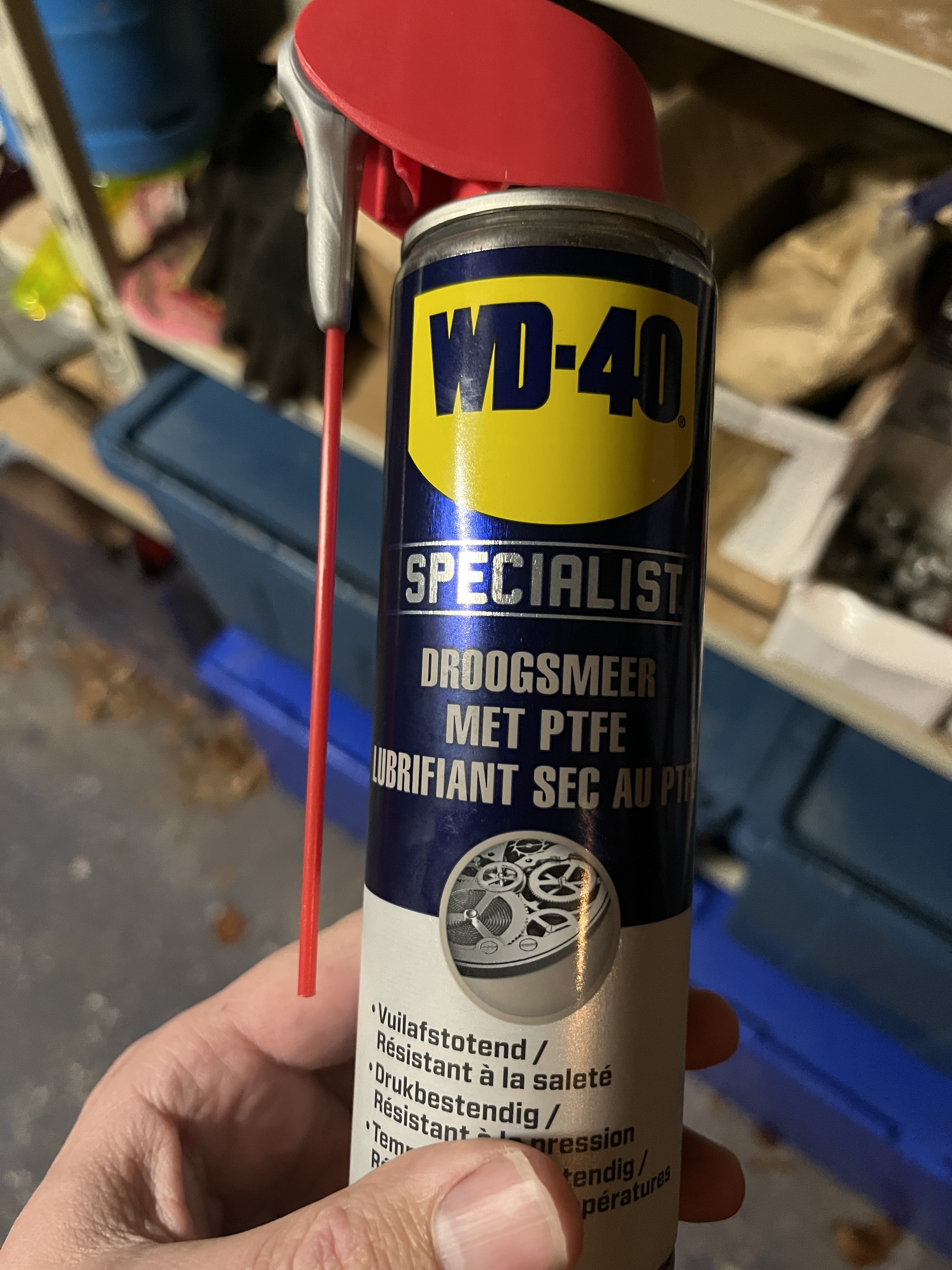 Ik heb mijn bussen gechecked. Maar overal zit oplosmiddel in. Deze droogt droog op. Dit is van het merk wd40, maar het is geen wd40. Het is teflon droogsmeer. Maar of ik dit er zelf op zou spuiten? Ik denk van niet.