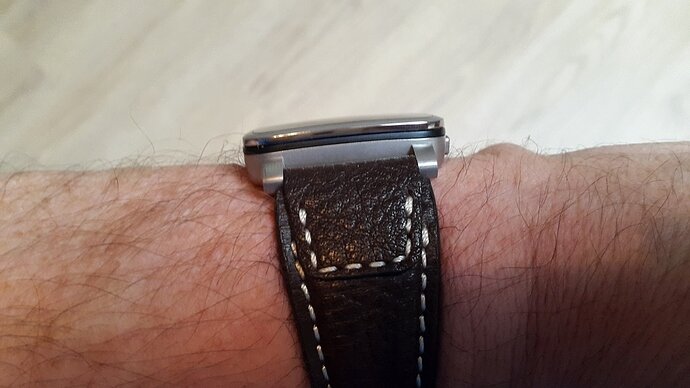 Zo kwam ie binnen. Nog niet op staal, die band wordt nagestuurd. Problemen met het tempo van de toeleverancier. Het grijze lederen (uiterst comfortabele) bandje heb ik er afgehaald (dat kan zonder gereedschap, met een handig schuifje bij de springbar) en vervangen door een bruin lederen, standaard 22mm, band die ik weken geleden al bij de specialist in horlogebanden punt nl had gekocht. Daar moest wel een bandaanzetter voor worden gebruikt, evenals standaard springbars.