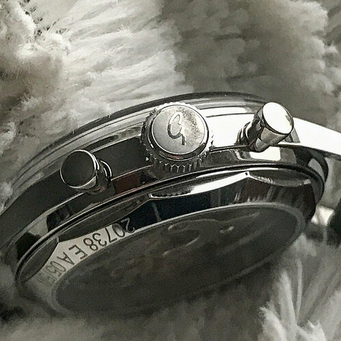 Binnengekomen: een fout in de matte finish van de gesigneerde kroon. Het matte deel was in een halve maan vorm bij het sandblasten waarschijnlijk niet goed gegaan, het was donkerder van kleur en zag er iets grover uit. Optisch met het blote oog duidelijk zichtbaar, maar toch lastig te fotograferen.