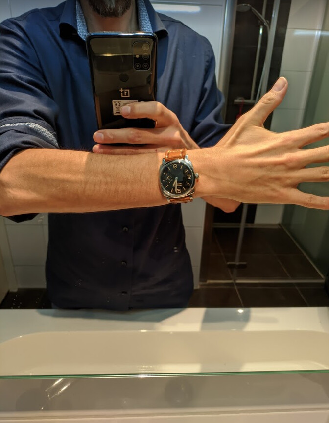ik heb geen vrienden, alleen mensen die ik tolereer, maar hier is een plaatje van een 42mm Radiomir op een 16cm pols in de hotelkamer