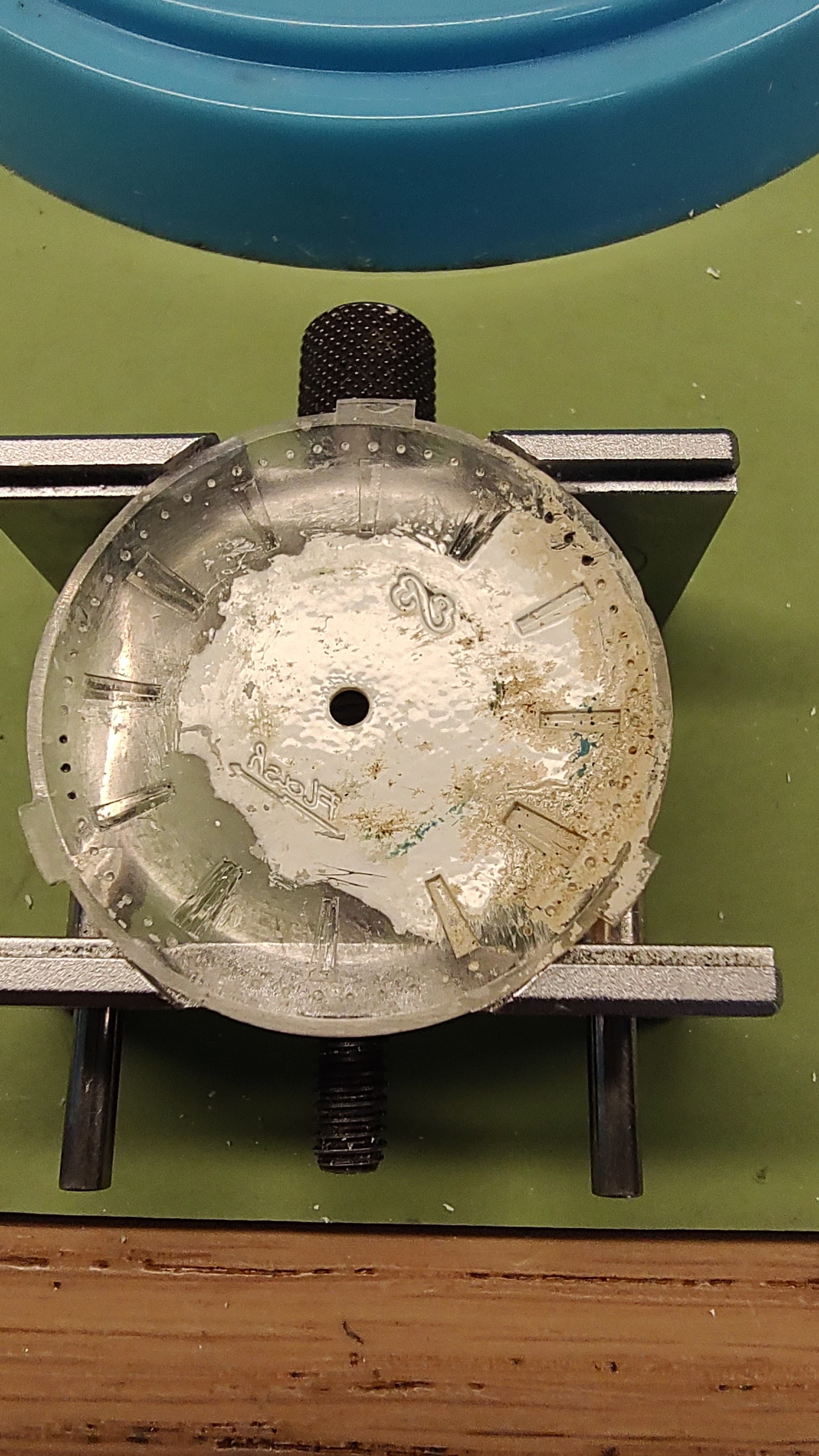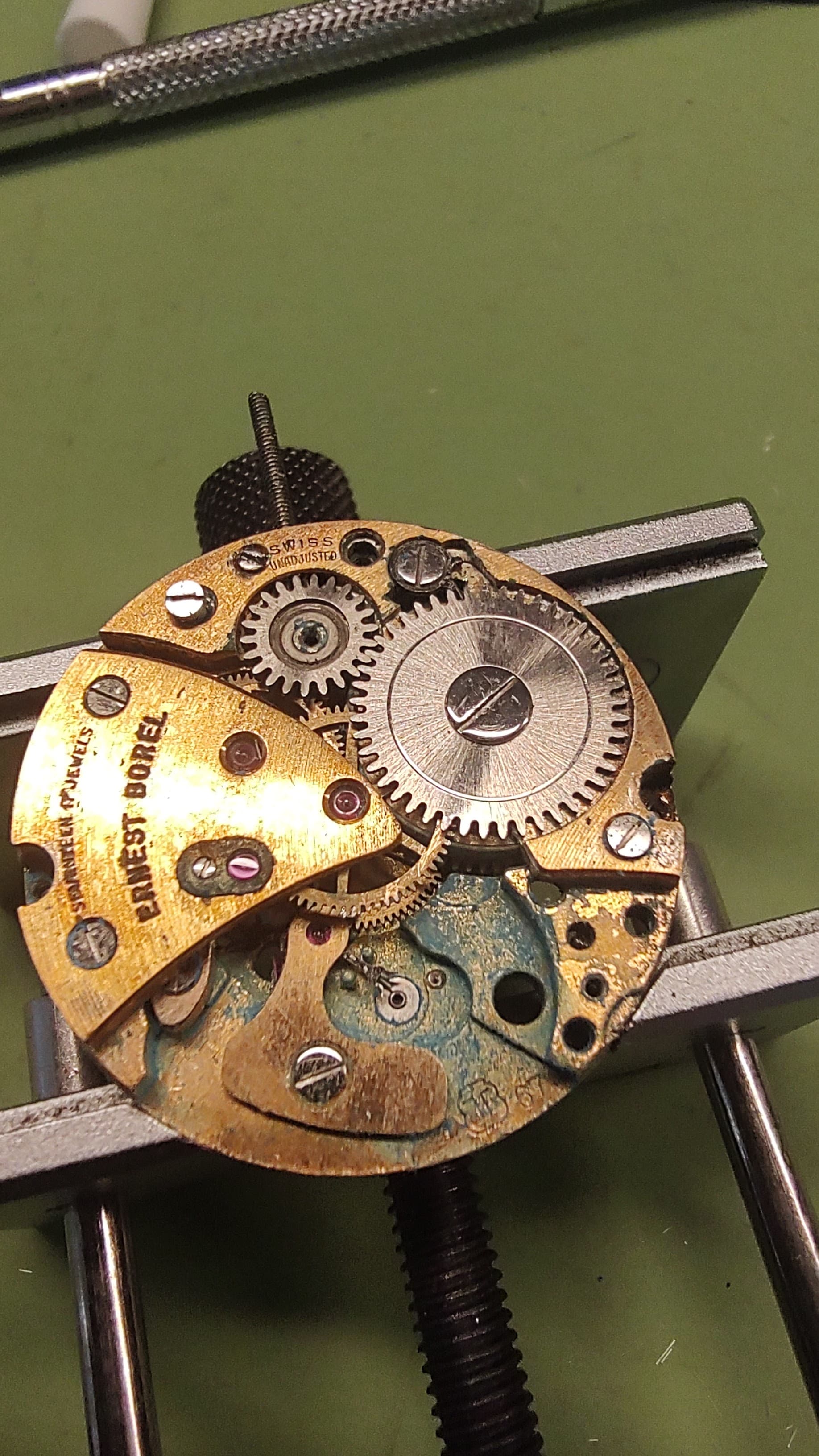 De wijzerplaat was totaal lelijk en aangevreten. En erger: de lettertjes Ernest Borel waren helemaal los. Bij de eerste aanraking, toen ik erachter kwam dat ze los op de bovenkant van de wijzerplaat lagen was het al meteen te laat.